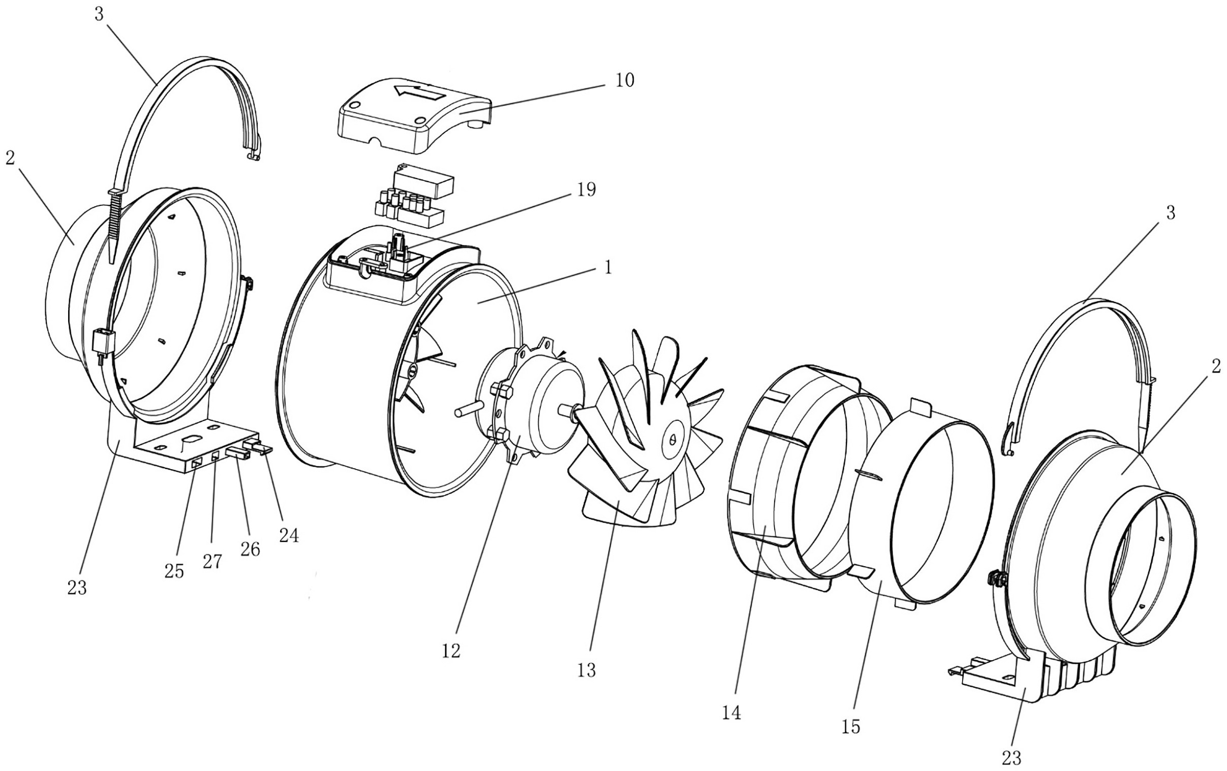 本实用新型涉及一种轴流风机,包括主风道以及对称设置在主风道两端的风口座,风口座两侧分别设置有齿孔与连接孔,风口座上部装配有配合风口座和主风道相接处的抱箍,抱箍一端设置有与齿孔配合的齿扣,抱箍另一端设置有与连接孔配合的连接柱,风口座底部设置有吊装板,吊装板前端设置有锁扣以及与锁扣匹配的锁口,两风口座底部的吊装板前端相接,一端风口座上的锁扣插入另一端风口座上的锁口。本实用新型结构采用风口座、主风道与抱箍通过预设的齿扣/齿孔、连接孔/连接柱的方式固定,易于根据需求调整,拆装调换方便。