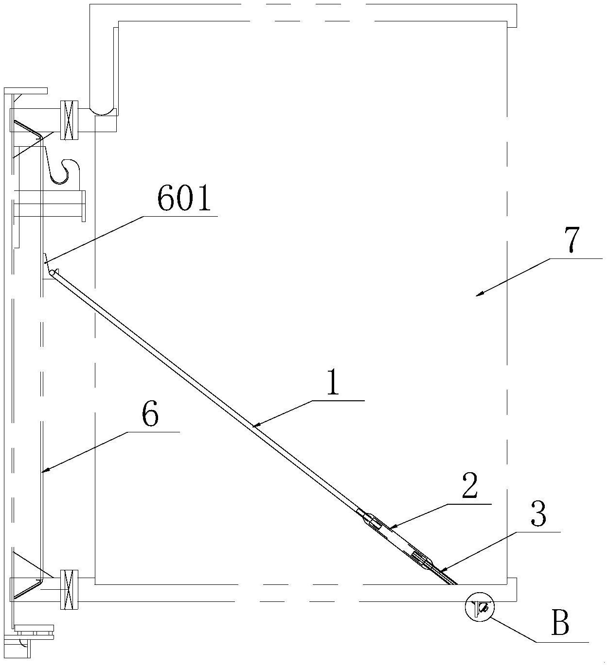 本实用新型公开了一种可调节的片散拉螺杆结构,包括拉螺杆本体、花篮、螺栓、角钢和半球形调节块;所述花篮设于拉螺杆本体和螺栓之间,用于连接拉螺杆本体和螺栓;所述拉螺杆本体的一端设有吊环,与变压器油箱壁上的吊钩配合连接;所述拉螺杆本体的另一端与花篮通过螺纹连接;所述角钢呈L型,固定于片散的底部;所述螺栓依次穿过半球形调节块和角钢上的连接孔,与花篮通过螺纹连接;所述螺栓的头部与半球形调节块的平面相抵,所述半球形调节块的球面与角钢的侧面相切。本实用新型的可调节的片散拉螺杆结构通过设置花篮来调节拉螺杆的长度,通过设置半球形调节块来调节拉螺杆的安装角度,使得该片散拉螺杆结构的通用性能好,便于批量生产。