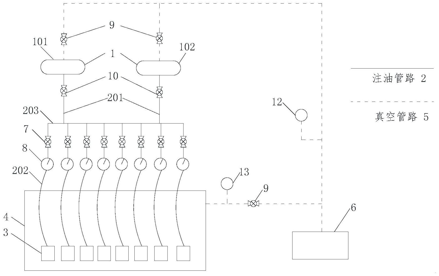 本发明的变压器真空定量注油方法可对多台变压器同时进行注油,效率较高;注油时,先在控制器中设置好每台变压器的注油量;启动抽真空机组对储油罐和真空罐同时抽真空至全真空状态;然后,打开油路分控电磁阀对各变压器进行注油,同时抽真空机组不停;当某台变压器的注油量达到设定值时,关闭该变压器对应的油路分控电磁阀,直至所有的油路分控电磁阀关闭;最后,继续抽真空脱气,完成注油工艺。该方法对变压器进行定量注油,注油量达到设定值后,控制器控制阀门自动关闭,操作方便可靠;注油时将真空罐和储油罐一起抽真空,使储油罐和真空罐保持同样的真空度,注油速度得到降低,且注油时的液压油中几乎不夹带气泡,避免了注油过程中产生气泡沫。