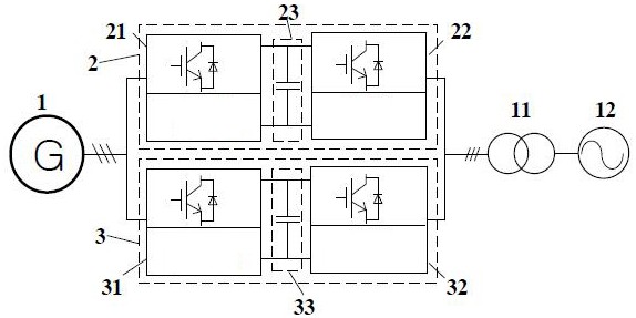 本实用新型公开了一种风电变流器并联系统,包括风力发电机、两路并联模块、变压器和电网,并联模块包括电机侧变流器、电容、电网侧变流器,所述风力发电机的输出分别连接至两路并联模块,两路并联模块的输出均连接至变压器,通过电压器输出到电网;两路并联模块还配置有一风电变流器并联控制装置,通过风电变流器并联控制装置的均流控制两路并联模块。通过本实用新型可有效解决风电变流器电机侧变流器并联模块间不均流的问题,特别适用于风电变流器能量变换系统。