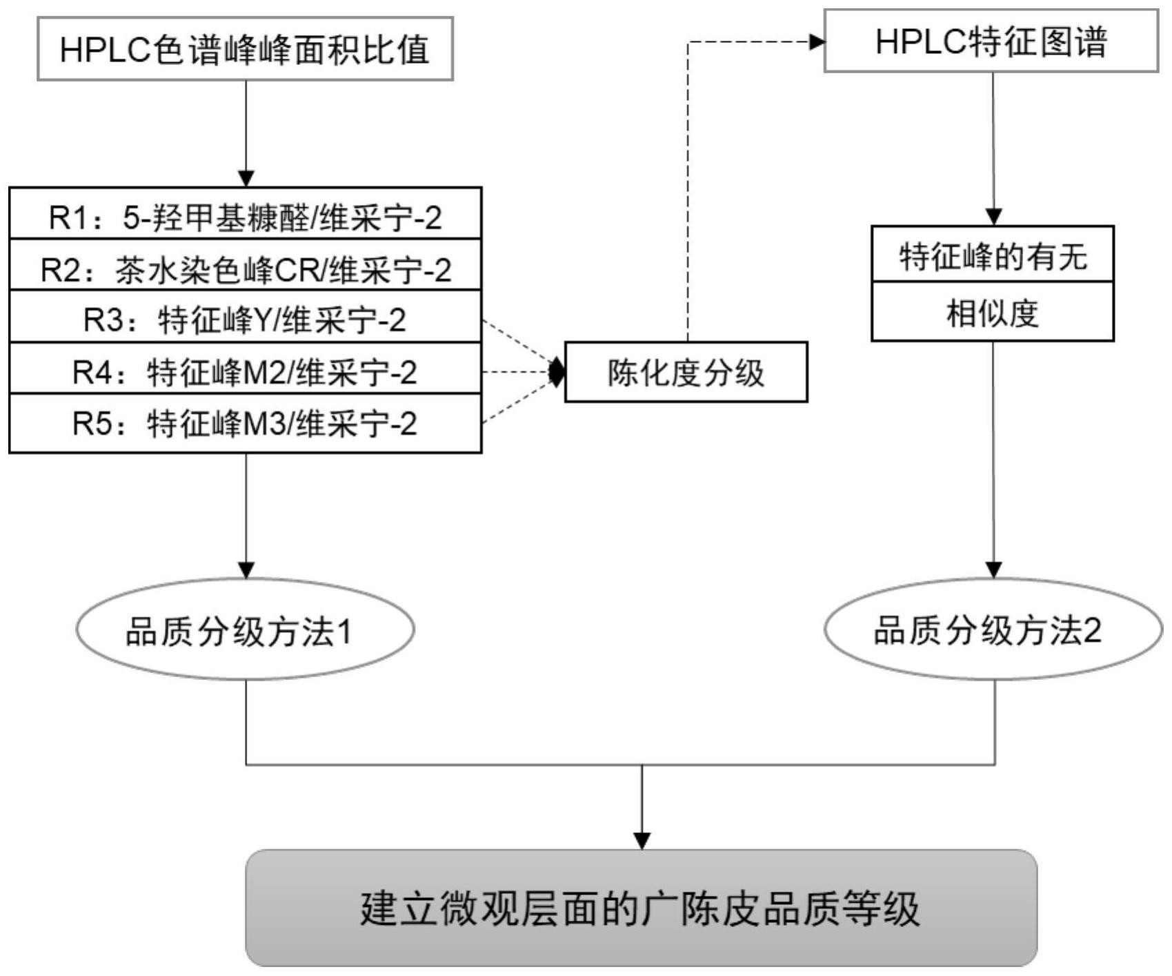 本发明涉及一种陈皮的检测分级方法,该检测分级方法采用高效液相色谱法,特别是配合合适的高效液相色谱条件,对不同品质级别陈皮间存在的差异成分进行检测,并分析这些差异成分的峰面积,特别是这些差异成分的峰面积与维采宁‑2峰面积的比值,确定待测陈皮的类型,最终实现待测陈皮品质评价,本发明检测分级方法直观且量化,能客观、准确地实现陈皮品质鉴别,为陈皮的质量控制提供稳定、可靠的技术手段。并且,本发明的检测分级方法具有实用性好和相关性特点,能推动陈皮行业的高质量发展。同时,本发明突破了以年份论品质的传统理念,为陈皮质量标准的完善提供新思路和新技术支持。