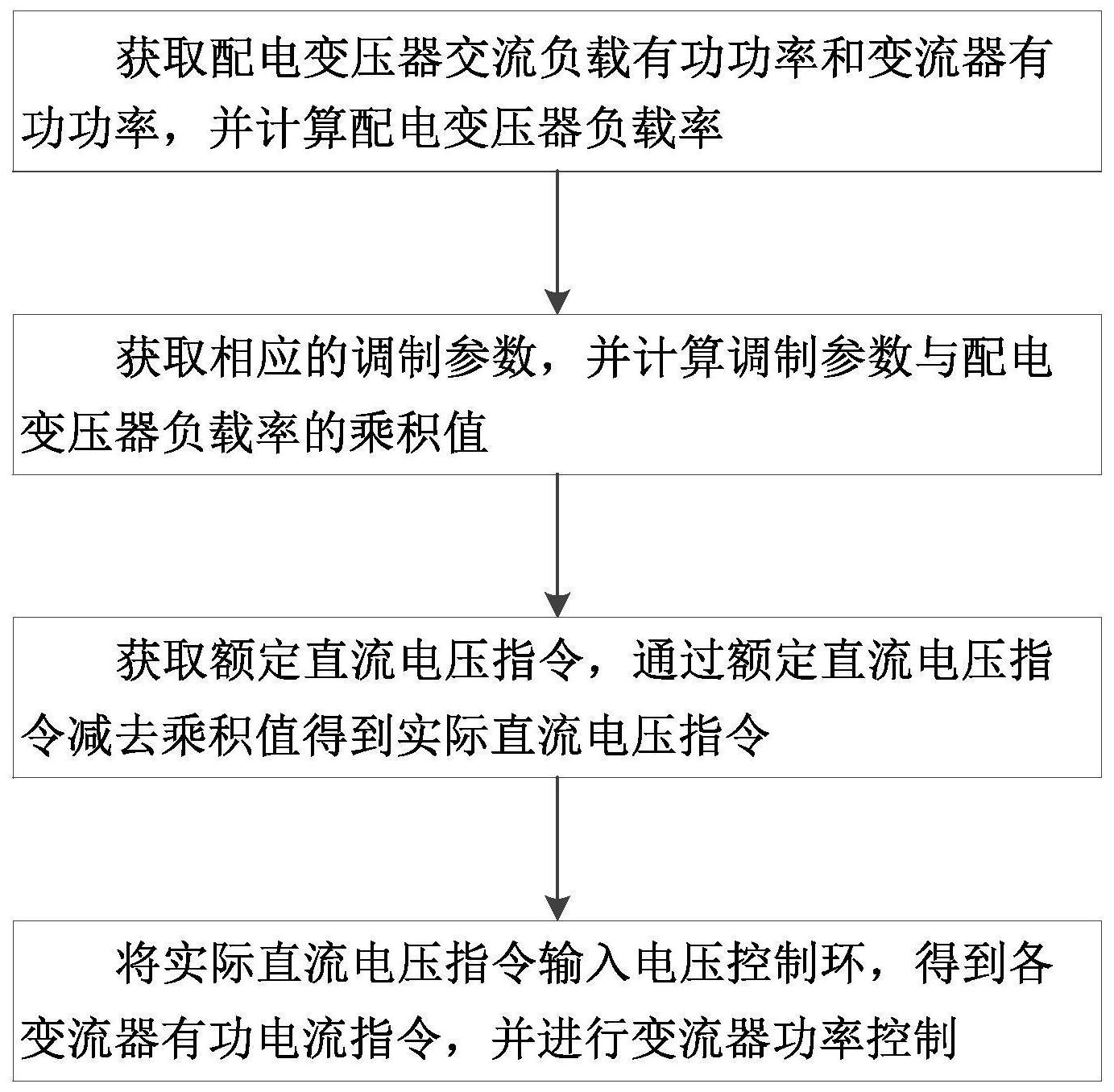 本发明公开了一种无通信下台区低压直流柔性互联功率控制方法、系统、装置及存储介质,其方法包括:获取配电变压器交流负载有功功率和变流器有功功率,并计算配电变压器负载率;获取调制参数,并计算调制参数与配电变压器负载率的乘积值;获取额定直流电压指令,通过额定直流电压指令减去乘积值得到实际直流电压指令;将实际直流电压指令输入电压控制环,得到各变流器有功电流指令,并进行变流器功率控制;本发明能够保证无通信情况下,互联系统正常工作。