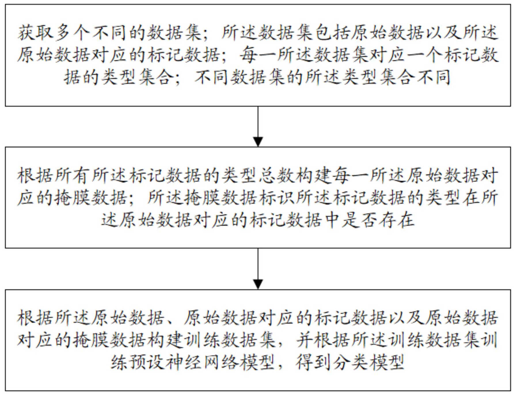 本发明提供的一种多数据集的联合训练方法及终端,通过一个预设神经网络模型上同时对多个不同的数据集上进行联合训练,得到最优分类模型,以此方式避免维护多个模型,减少模型推理次数,提高模型训练效率。同时本发明根据所有所述标记数据的类型总数构建掩膜数据,使得多个数据集在进行联合训练时,无需补充标注某一数据集中未标注数据,减少数据标注的工作量;并且避免在不同数据集上生成伪标签,屏蔽训练过程中未标注数据所带来的误差,提高多数据集的联合训练模型的精度。