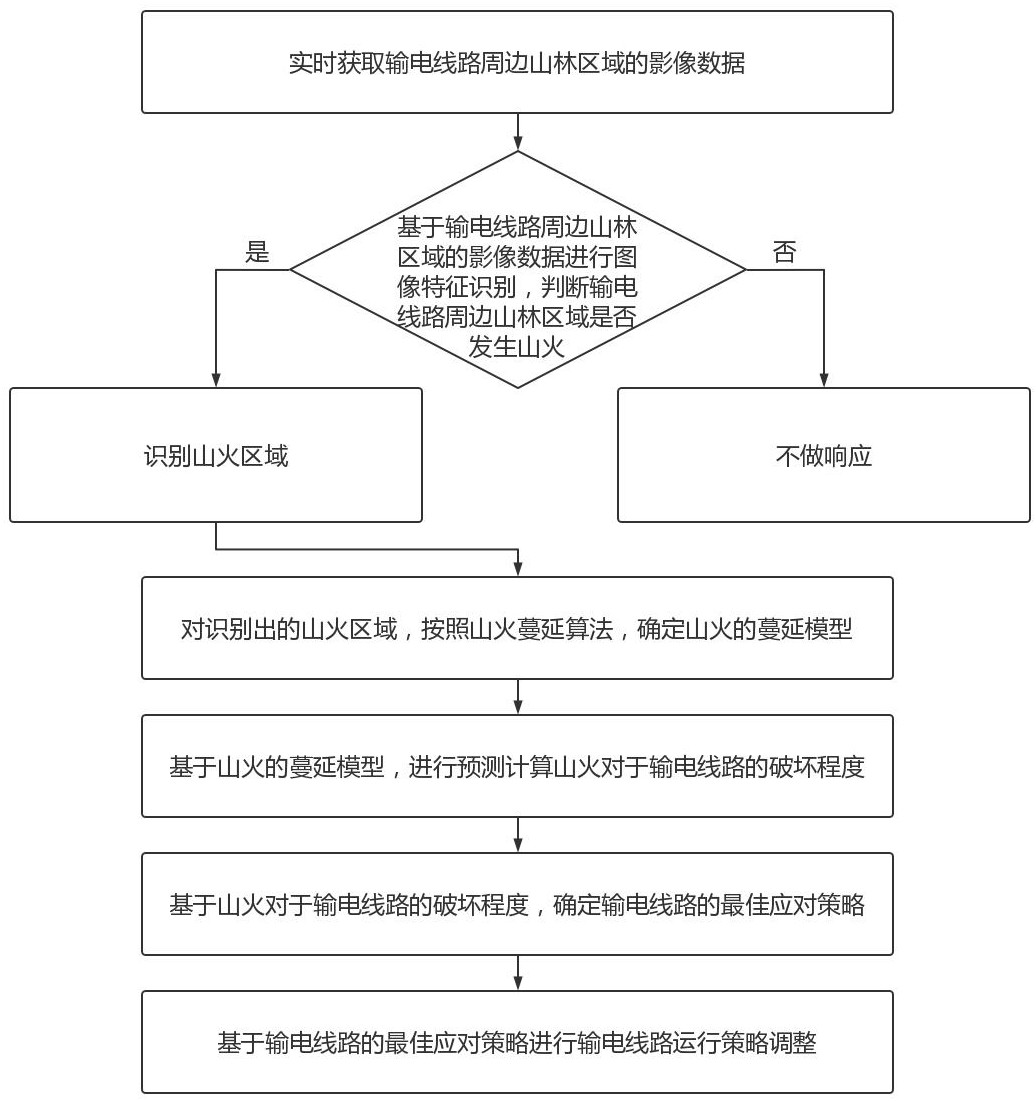 本发明公开了一种输电线路山火动态实时监测方法及系统,涉及线路安全监测技术领域,包括:实时获取输电线路周边山林区域的影像数据;基于输电线路周边山林区域的影像数据进行图像特征识别,判断输电线路周边山林区域是否发生山火,若是,则识别山火区域,若否,则不做响应;确定山火的蔓延模型;进行预测计算山火对于输电线路的破坏程度;确定输电线路的最佳应对策略;基于输电线路的最佳应对策略进行输电线路运行策略调整。本发明的优点在于:可实现山火对于输电线路的破坏情况的预先预测,实现对于发现的山火灾情的预先应对,最小化输电线路受灾范围,提高灾后线路修复工作的及时性,确保输电线路的安全稳定运行。