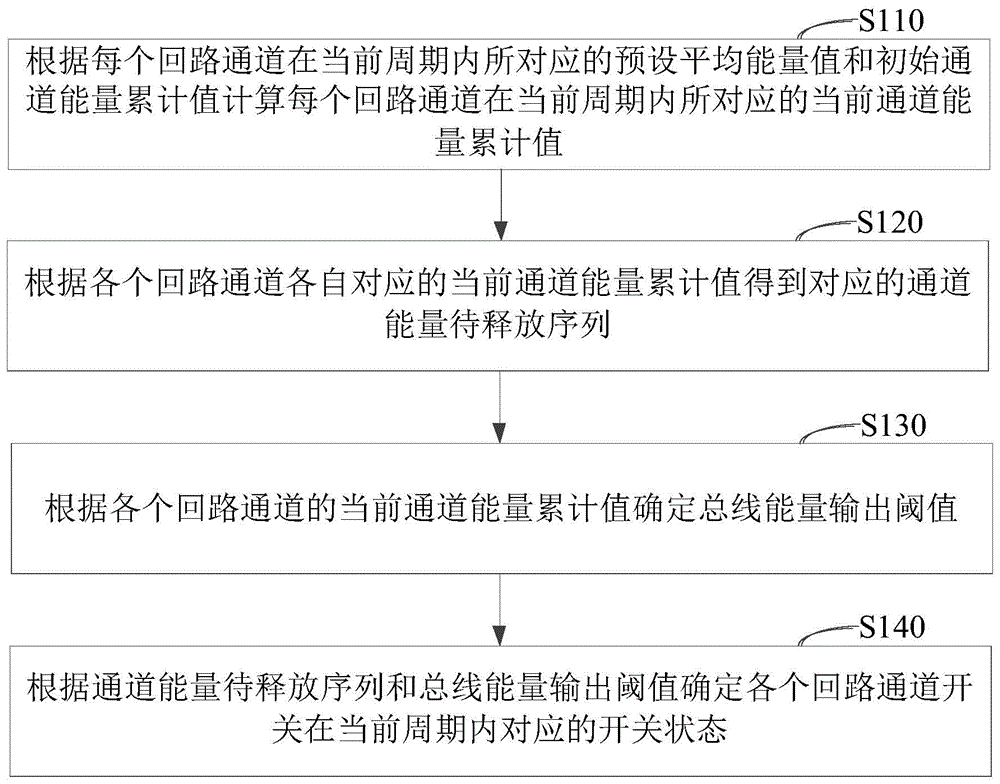 本发明涉及总线能量控制方法、系统、设备终端和计算机存储介质,该总线能量控制方法包括:根据每个回路通道在当前周期内所对应的预设平均能量值和初始通道能量累计值计算每个回路通道在当前周期内所对应的当前通道能量累计值,根据各个回路通道各自对应的当前通道能量累计值得到对应的通道能量待释放序列,根据各个回路通道的当前通道能量累计值确定总线能量输出阈值,根据通道能量待释放序列和总线能量输出阈值确定各个回路通道开关在当前周期内对应的开关状态。上述总线能量控制方法,能够在最小单元周期内有效地控制总线能量均匀输出且保证各个回路通道达到设定需要输出的能量,实现了多个回路通道对应能量的合理分配。