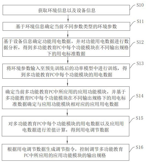 本申请涉及电源管理的领域,尤其是涉及一种多功能教育PC的电源管理方法、装置、设备及介质。方法包括:获取环境信息以及设备信息,基于环境信息确定环境参数,基于设备信息确定功能用电数据,并对功能用电数据进行数据分析,得到用电标准数据,将环境参数输入至预先训练后的功率模型中进行训练,得到用电数据,确定当前多功能教育PC中所应用的应用功能模块,并基于用电标准数据确定与应用功能模块相对应的应用用电数据,对用电数据以及应用用电数据进行差值计算,得到用电调节数据,根据用电调节数据生成调节指令,控制调节输出规格,本申请具有提高电源管理分配合理性以及电源利用率的效果。