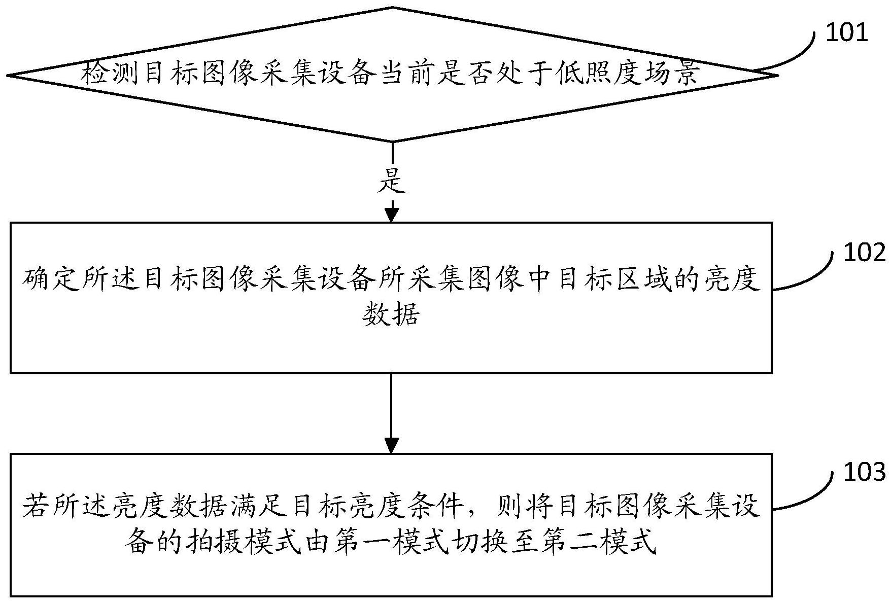 本申请提供了一种拍摄模式切换方法、电子设备及存储介质,该方法包括:检测目标图像采集设备当前是否处于低照度场景;若是,确定所述目标图像采集设备所采集图像中目标区域的亮度数据;若所述亮度数据满足目标亮度条件,则将目标图像采集设备的拍摄模式由第一模式切换至第二模式。本申请由于通过初步判断目标图像采集设备当前处于低照度场景时,进一步判断目标图像采集设备所采集图像中目标区域的亮度数据是否满足目标亮度条件,在目标区域的亮度数据满足目标亮度条件时进行拍摄模式的切换,这样可以准确基于目标区域的亮度数据来进行模式切换,可以采集到较高图像质量的图像,提高图像识别效果。