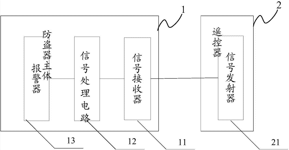 本实用新型公开提供了一种自行车防盗器。该防盗器主要包括:防盗器主体和遥控器。其中防盗器主体包括信号接收器、信号处理电路和报警器,遥控器包括信号发射器。车主可通过遥控器的信号发射器向防盗器主体的信号接收器发送警报解除信号,进而信号处理电路根据该警报解除信号控制报警器停止报警。本实用新型可通过遥控器实现对防盗器主体的远距离警报解除操作,相对于现有技术而言,本实用新型所公开的自行车防盗器操作简单。