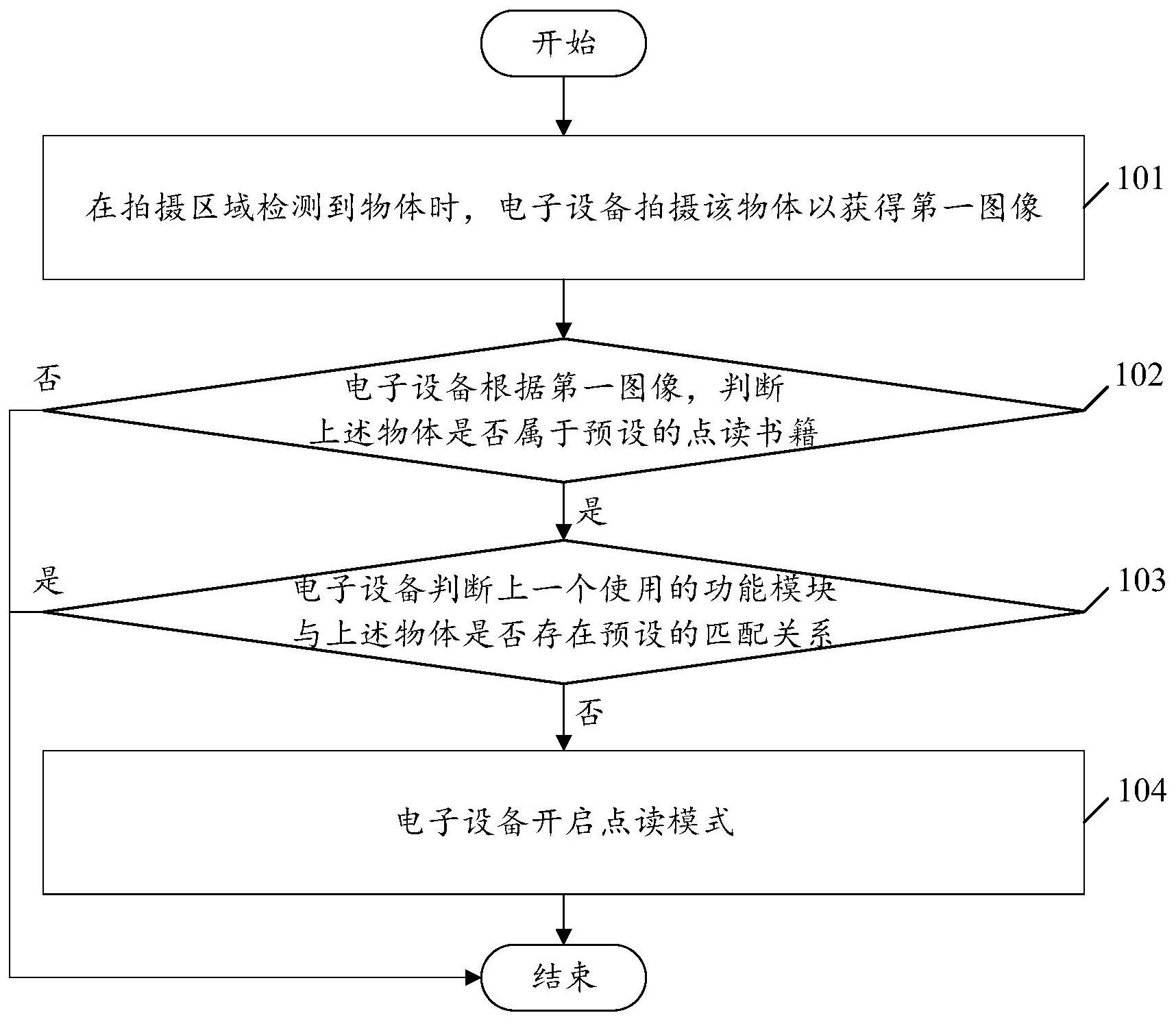 本发明实施例涉及教育技术领域,公开了一种点读模式的开启方法及电子设备,该方法包括:在拍摄区域检测到物体时,拍摄该物体以获得第一图像;根据第一图像,判断该物体是否属于预设的点读书籍;若该物体属于预设的点读书籍,判断上一个使用的功能模块与该物体是否存在预设的匹配关系;若上一个使用的功能模块与该物体不存在匹配关系,开启点读模式。可见,实施本发明实施例,用户无需手动点击点读功能对应的虚拟按钮,简化了开启点读功能的操作,进而能够提升用户体验。