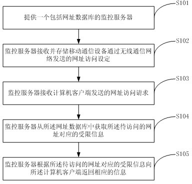 本申请公开一种基于云计算的上网监控方法、监控系统以及监控服务器,所述方法包括:提供一个监控服务器,所述监控服务器中包括有网址数据库;监控服务器接收并存储移动通信设备通过无线通信网络发送的网址访问设定;监控服务器接收计算机客户端发送的网址访问请求;以待访问的网址作为网址信息,从所述网址数据库中获取所述待访问的网址对应的受限信息;根据所述待访问的网址对应的受限信息向所述计算机客户端返回相应的信息。应用该方案,用户可以远程实时的对监控服务器中网址数据库中的访问规则进行更新设定。本方案能够全面的限制计算机客户端的网络访问,达到及时防范互联网不良信息、为广大网民提供健康、安全、文明的网络环境的目的。