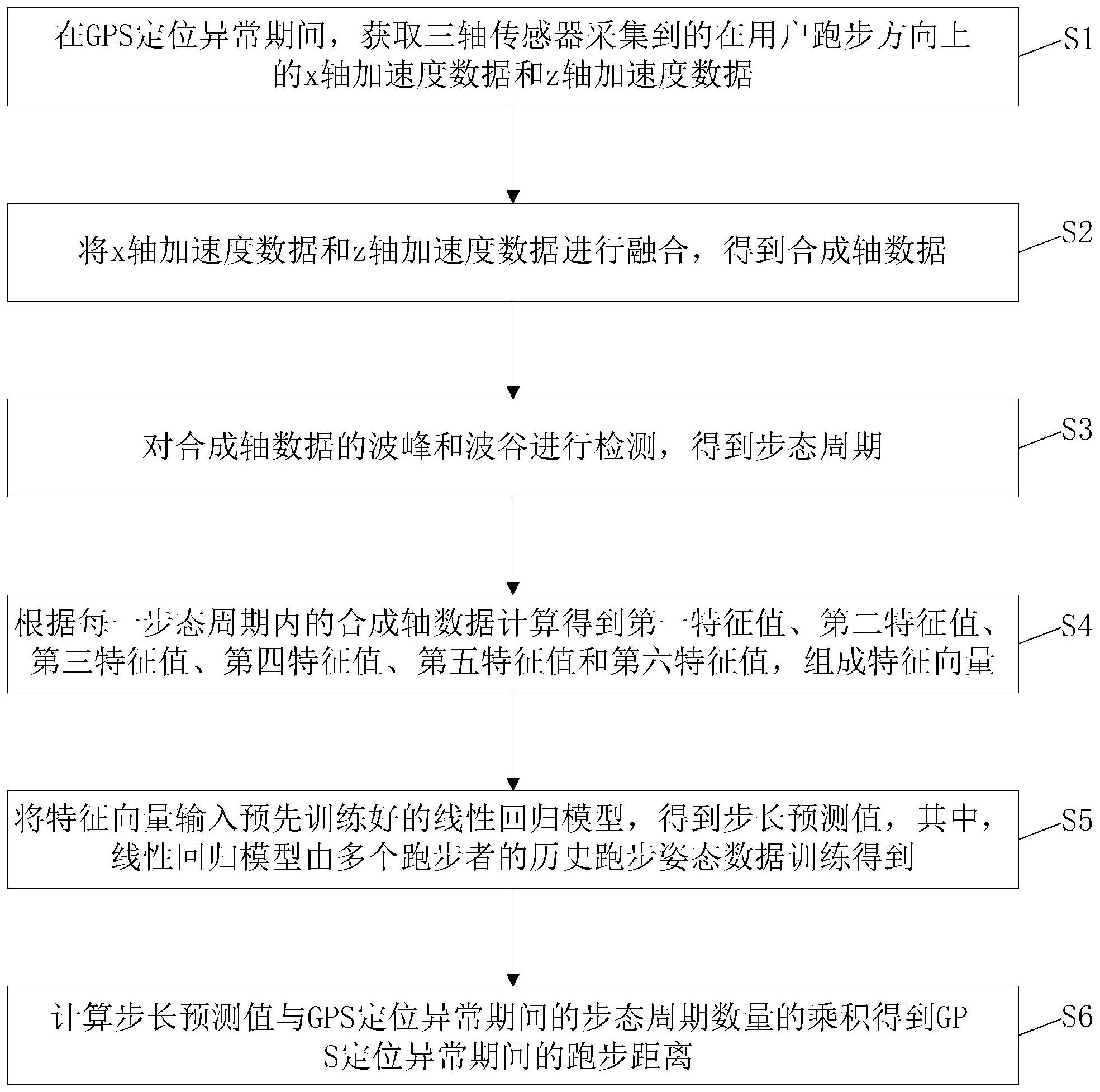 本发明公开了一种基于三轴传感器的跑步距离校正方法,其包括:S1:在GPS定位异常期间,获取三轴传感器采集到的在用户跑步方向上的x轴加速度数据和z轴加速度数据;S2:将两个轴的加速度数据进行融合,得到合成轴数据;S3:对合成轴数据的波峰和波谷进行检测,得到步态周期;S4:根据每一步态周期内的合成轴数据计算得到第一特征值、第二特征值、第三特征值、第四特征值、第五特征值和第六特征值,组成特征向量;S5:将特征向量输入预先训练好的线性回归模型,得到步长预测值;S6:计算步长预测值与GPS定位异常期间的步态周期数量的乘积得到GPS定位异常期间的跑步距离。本发明能够提高跑步距离计算的准确率以及稳定性。