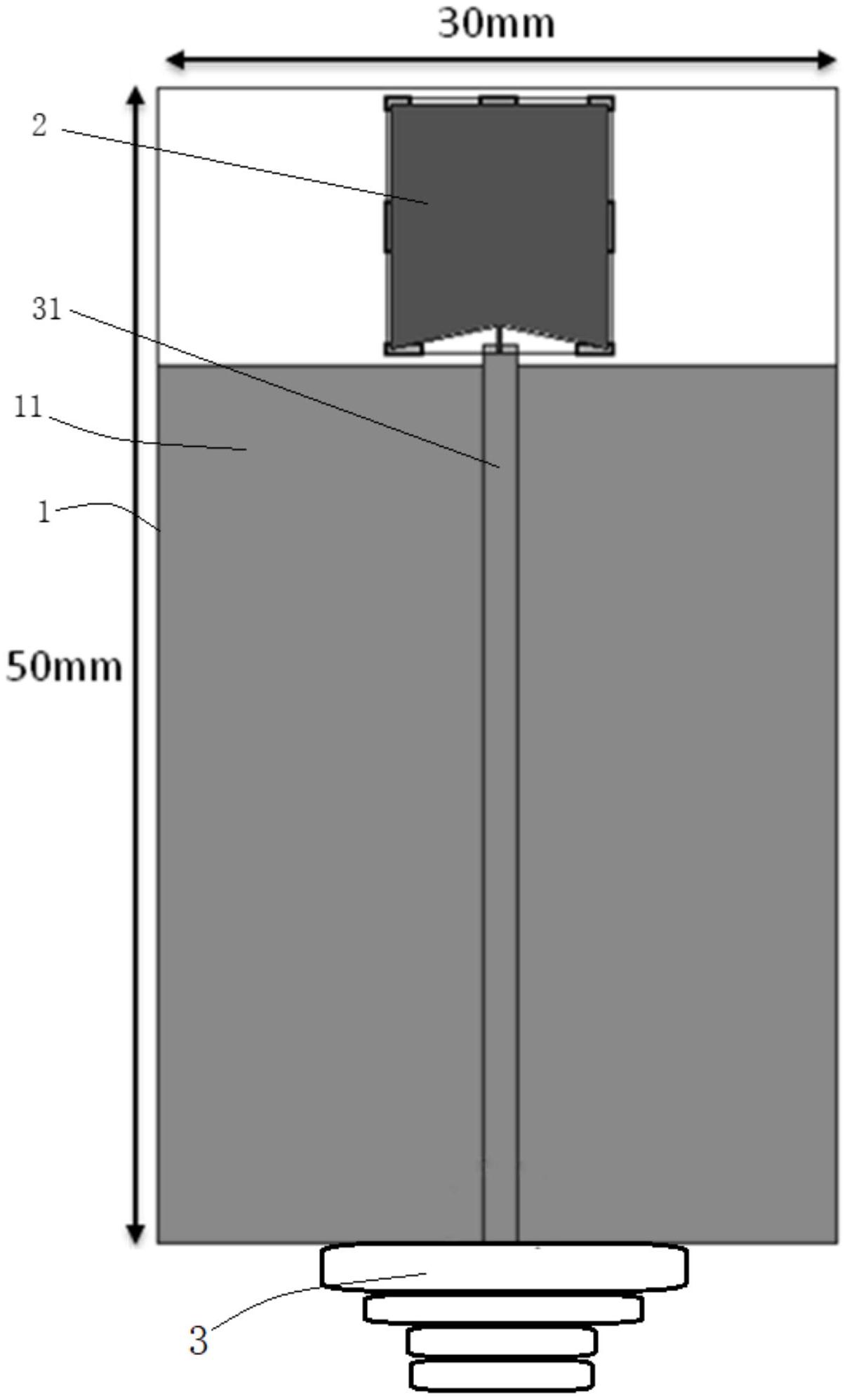 本实用新型公开了一种具有超宽频带的天线结构,包括基板、天线模块和连接接头,所述天线模块设置在所述基板的板面上,所述连接接头具有连接线,所述连接接头通过所述连接线与所述天线模块相连,所述天线模块包括第一材料层和第二材料层,所述第一材料层和第二材料层嵌套设置。所述基板为矩形面板,所述矩形面板具有上板面,所述天线模块设置在所述上板面上,且所述天线模块位于所述上板面的边缘,所述天线模块与所述上板面固定连接。本实用新型所述天线结构可以实现大于5GHz的超宽带天线,在天线模块内形成天线辐射层,实现了天线的超宽带性能。
