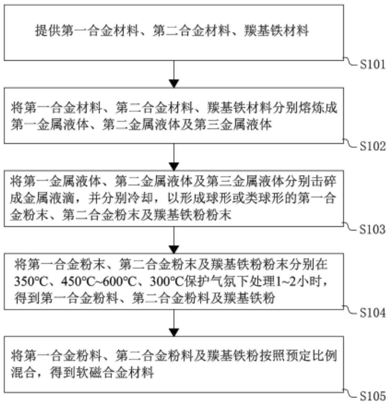 本申请公开一种软磁合金材料及制备方法,制备方法包括:提供第一合金材料、第二合金材料以及羰基铁材料,分别熔炼成第一金属液体、第二金属液体及第三金属液体,并分别冷却;将冷却得到的第一合金粉末、第二合金粉末及羰基铁粉粉末分别在350℃、450℃~600℃、300℃保护气氛下处理1~2小时,得到第一合金粉料、第二合金粉料及羰基铁粉;将第一合金粉料、第二合金粉料及羰基铁粉按照预定比例混合后,还可与邻甲酚醛环氧树脂、甲基纳迪克酸酐、芐基三苯基溴化磷、2‑甲基咪唑、三氧化二锑、硅微粉、甲基丙烯酰氧基丙基三甲氧基硅烷及脱模剂混合,得到混合材料;将混合材料在100℃下进行熔融混合后,进行冷却、破碎及过筛,得到软磁合金材料。