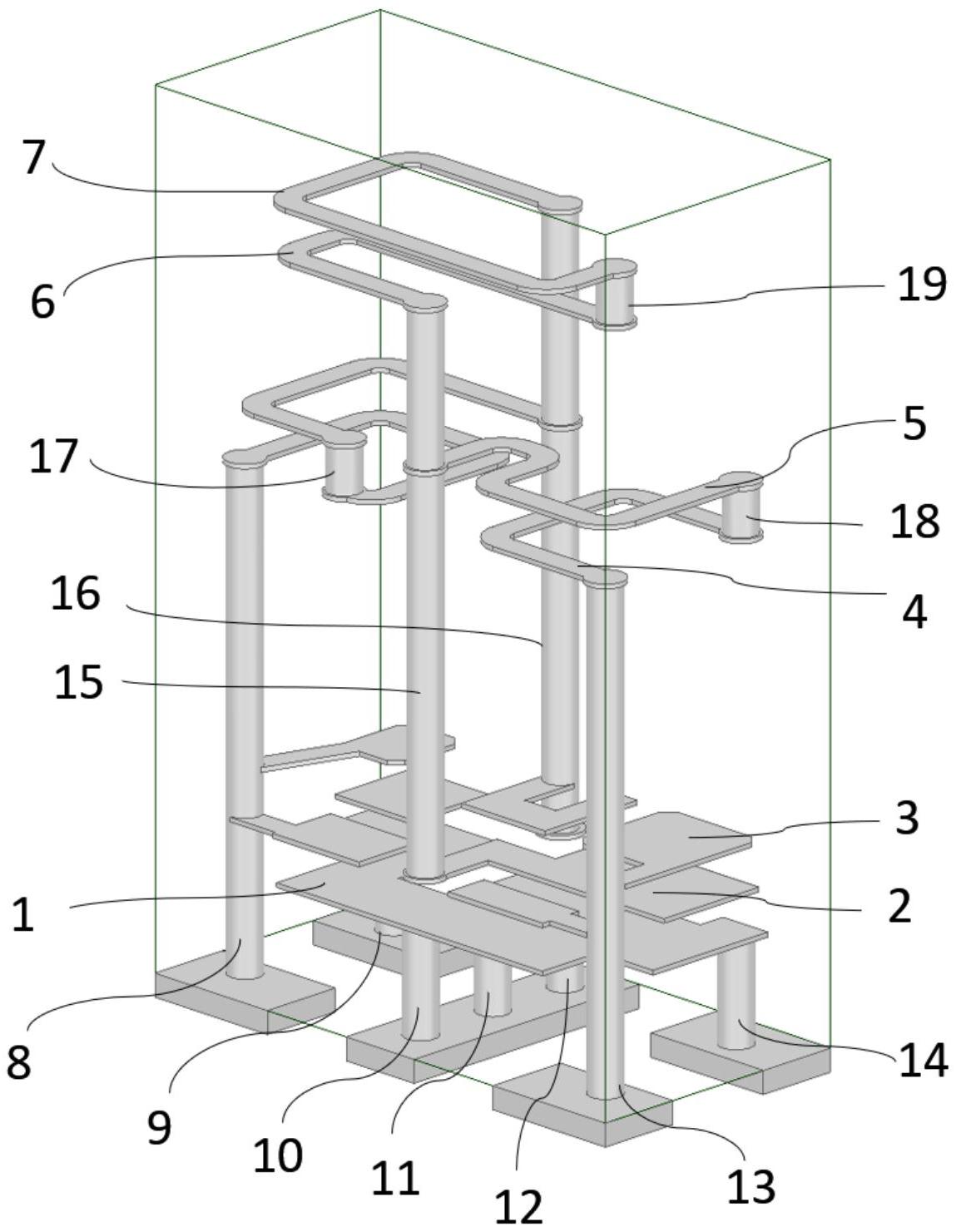 一种叠层片式低通滤波器,该低通滤波器采用集总参数设计结构,由低通滤波器原型外加传输零点而成。此款低通滤波器采用LTCC技术,然后通过900℃左右低温共烧而成。本发明解决其技术问题采用的技术方案是:一种新型小型化叠层片式低通滤波器,包括基体、设置在基体外侧的接线端头和设置在基体内部的电路层,所述的基体内部的电路层呈叠层结构。本发明的有益效果是:本发明以LTCC(低温共烧陶瓷)技术为基础,采用集总参数模型设计实现叠层片式低通滤波器的特殊电性能要求。本发明有效实现了低通滤波器的特性,且具有低损耗、高抑制、高可靠性、低成本和适合于大规模的生产等优点,另外还适应了新的电子元件集成化、小型化的发展趋势。