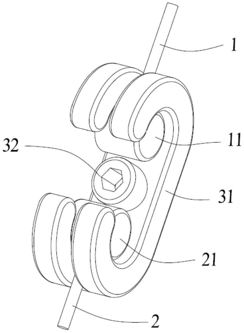 本实用新型涉及拉线连接器,用于连接具有第一端子的第一拉线和具有第二端子的第二拉线,拉线线接器包括有连接器主体和限位螺钉,连接器主体包括有连接部、位于连接部两侧的第一挂钩部和第二挂钩部,在第一挂钩部设有第一卡槽,在第二挂钩部具有第二卡槽,限位螺钉可拆卸的安装在连接部的螺孔中;使用时第一端子卡位于第一挂钩部并且第一拉线卡位于第一卡槽中,第二端子卡位于第二挂钩部并且第二拉线卡位于第二卡槽中。拉线连接器结构简单可靠,方便安装及拆卸。