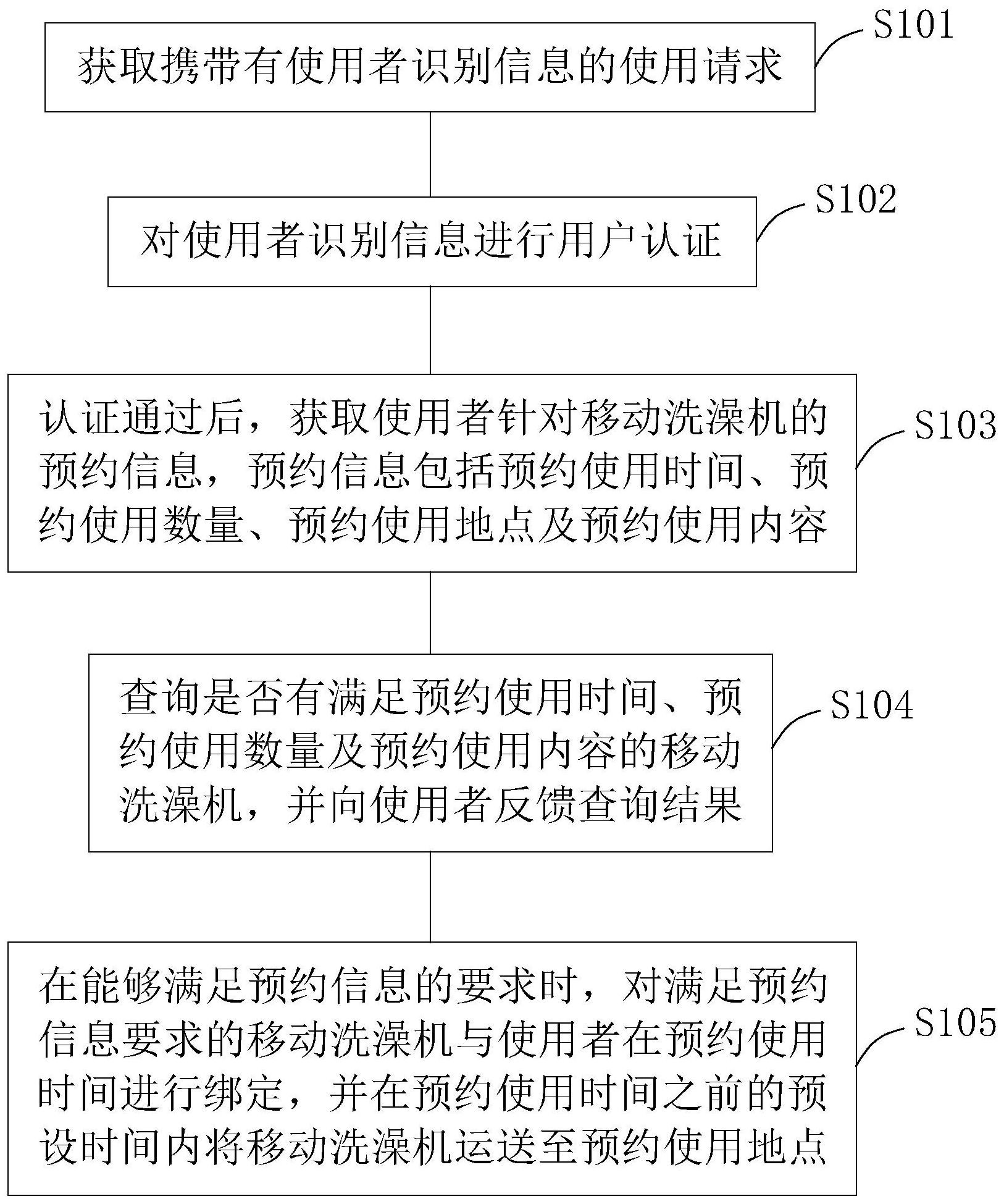 本发明公开了一种移动洗澡机及其使用方法,属于淋浴领域,包括获取使用者针对移动洗澡机、携带使用者识别信息的使用请求;根据使用请求,对使用者识别信息进行用户认证;认证通过后,获取使用者针对移动洗澡机的预约信息,预约信息包括预约使用时间、预约使用数量、预约使用地点及预约使用内容;根据预约信息对移动洗澡机的使用状态进行查询,筛选符合预约信息要求的移动洗澡机,并向使用者反馈查询结果;在能够满足预约信息的要求时,对满足预约信息要求的移动洗澡机与使用者在预约使用时间进行绑定,并且在预约使用时间之前的预设时间内将移动洗澡机运送至预约使用地点。实现移动洗澡机的合理配置,一机多用,提高了利用率,减少闲置。