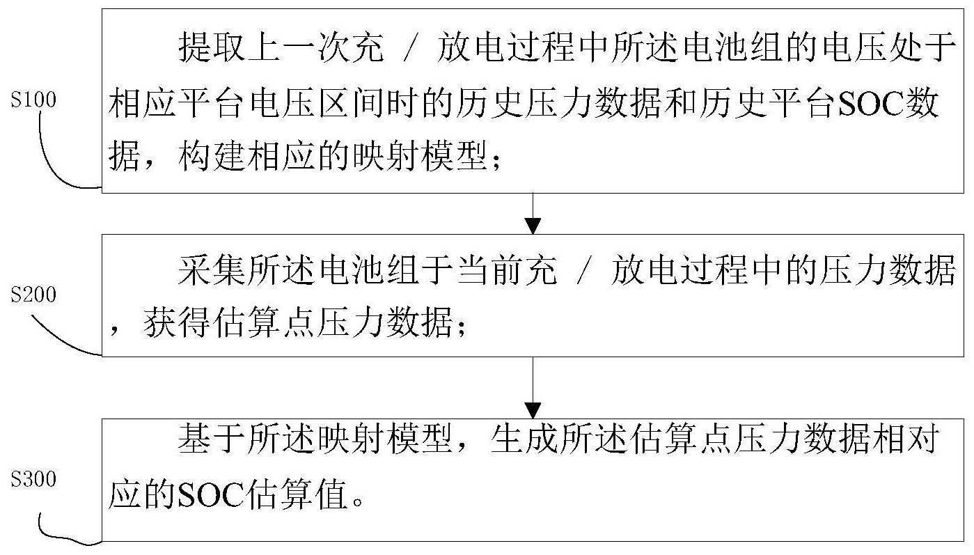 本发明公开一种SOC估算方法、装置及系统,其中方法包括当电池组的当前电压处于平台电压区间时,基于所述电池组的压力数据进行SOC估算的方法,包括以下步骤:提取上一次充/放电过程中所述电池组的电压处于相应平台电压区间时的历史压力数据和历史平台SOC数据,构建相应的映射模型;采集所述电池组于当前充/放电过程中的压力数据,获得估算点压力数据;基于所述映射模型,生成所述估算点压力数据相对应的SOC估算值。本发明通过压力数据与SOC状态的映射关系估算压力数据所对应的SOC状态,在保证估算结果精确性的前提下降低电压检测装置的精度要求、简化估算方法,有效降低成本。