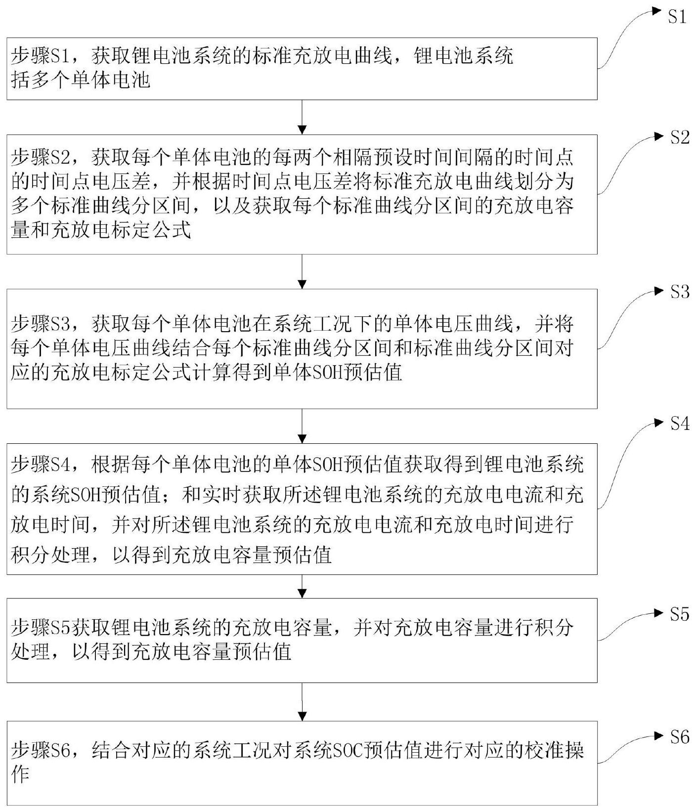 本发明提供一种锂电池系统的SOC估计方法及其系统,发明包括:根据每个单体电池的每两个相隔预设时间间隔的时间点之间的时间点电压差,将标准充放电曲线划分为多个标准曲线分区间,获取每个标准曲线分区间的充放电容量和充放电标定公式;将每个单体电压曲线结合标准曲线分区间和标准曲线分区间对应的充放电标定公式计算得到单体SOH预估值;根据每个单体电池的单体SOH预估值获取得到锂电池系统的系统SOH预估值;对所述锂电池系统的充放电电流和充放电时间进行积分处理,得到充放电容量预估值;根据系统SOH预估值和充放电容量预估值获取系统SOC预估值;结合对应的系统工况对系统SOC预估值进行校准操作。本发明的有益效果:通过精准预估SOH进而准确预估SOC。