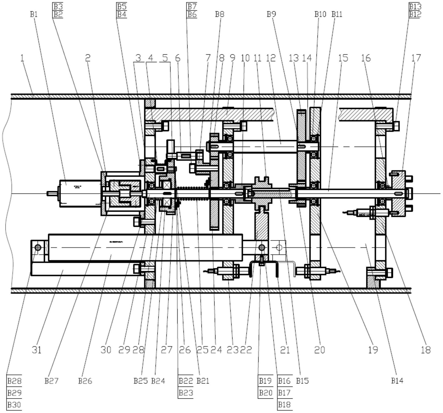 本实用新型公开了一种海流发电装置蓄能变速器,属于海流发电技术领域,其为海流发电装置叶片输入端和发电机输入端之间的一种传动装置,本实用新型提供的蓄能变速器可根据海水流速的不同,自动切换传动模式。当海水流速较低例如≤0.1m/s时,采用蓄能周期集中释放驱动的工作模式;当海水流速较高时例如>0.1m/s时,采用直驱模式,从而解决低速海流无法驱动发电机的问题,大大扩大了海流发电机的使用工况、以提高海流的能源利用率,实现了针对海流发电装置进行低速启动,并且在较大的流速范围内均能够实现海流发电装置的发电。