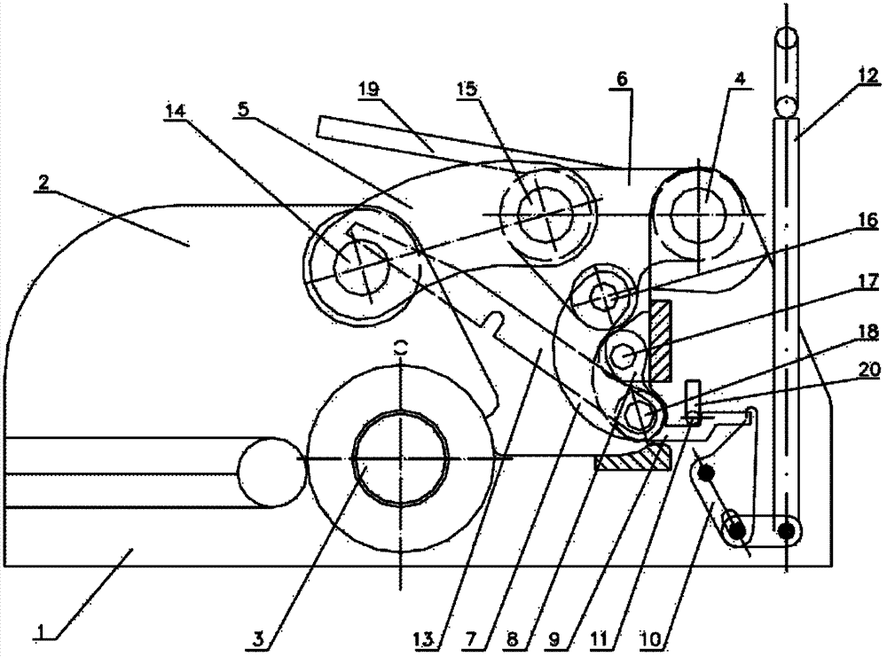 本发明涉及一种船用固定防台风系泊链索装置,可广泛用于舰船防台风时的水鼓系泊。包括底座和与底座相配置的手动张合机构,所述的手动张合机构包括一端与底座相铰接的压盖,压盖与底座的配置处内外分别设置内弧形槽和外弧形槽,所述的压盖通过连杆与一手动摇杆相连,手动摇杆的另一端与底座相铰接,由此构成双摇杆式手动张合机构,所述的手动张合机构的手动摇杆与一自锁机构相连,所述的自锁机构与手动解锁装置相连。本发明的有益效果在于:1、结构设置紧凑合理,可靠性高,外形小重量轻,承受载荷高,防台风系泊功能强;2、使用方便,具有快速夹持、自动锁紧和快速解锁防台风链索的功能,可广泛用于舰船防台风时的水鼓系泊。