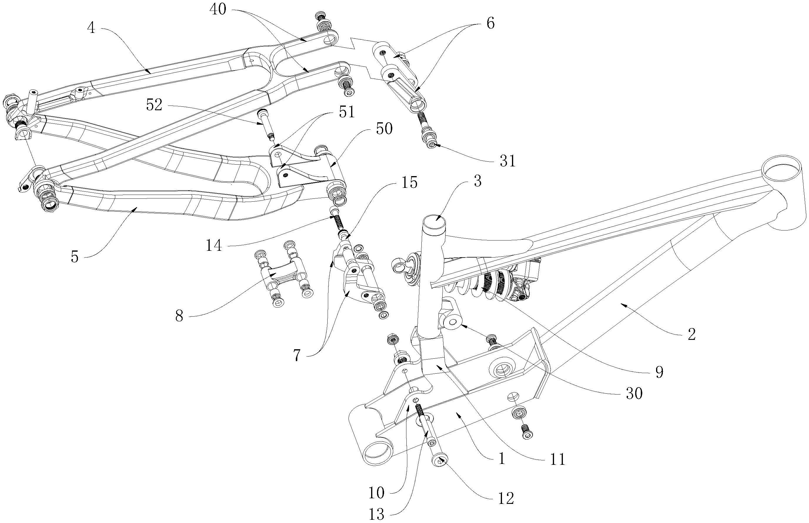 本实用新型公开了一种具有方舱盒的多连杆摇臂式避震车架,包括有方舱盒、下管、中管、上叉、下叉、两个上摇臂、两个第一下摇臂、第二下摇臂和避震器,上叉的前端形成有两个上叉接头,两个上摇臂的上端分别与两个上叉接头铰链连接,两个上摇臂的下端均与下管铰链连接,方舱盒的顶部形成有两个相互对称的支撑板,两个第一下摇臂的下端分别与两个支撑板铰链连接,两个第一下摇臂的上端均与避震器的后端铰链连接,避震器的前端与方舱盒的前端铰链连接,第二下摇臂的前端设于两个第一下摇臂之间,下叉的顶部形成有两个立板状的下叉接头,第二下摇臂的后端设于两个下叉接头之间。本实用新型联动机构合理、力学平衡度更佳、能延长避震器使用寿命。