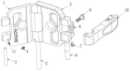 本实用新型公开了车架折叠盒结构,包括后接头、前接头、手柄轴、防脱机米、绞链轴、锁紧轴、定位螺丝、扭簧、调节螺丝、自锁手柄、止退螺丝,其特征在于左侧的后接头和右侧的前接头通过中间的绞链轴连接在一起,手柄轴可以竖直穿过后接头左侧,所述前接头右侧可穿过锁紧轴,所述前接头的右下侧设置一个定位螺丝,定位螺丝上方设有扭簧,扭簧右侧设有一个调节螺丝,所述后接头左下角设置一个止退螺丝,前接头和后接头之间设置一个自锁手柄。本实用新型通过前接头和后接头的开合控制自行车的折叠,自锁手柄配合防脱机米和止退螺丝可在折叠完成后自动对这个结构进行锁定,防止移动过程中打开。本实用新型还具有结构灵巧、组装方便的特点。