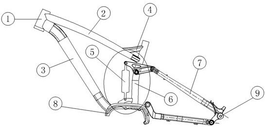 本实用新型公开了四连杆避震中置马达结构,包括头管、上管、下管、连接杆、避震器、中管、支架、电机座、固定螺栓,其特征在于电机座置于整个结构的最底部,电机座上方中部设置一个避震器,电机座内侧上方设置一个中管,上管左侧上方设置一个头管,头管下方右侧设置一个下管。本实用新型通过电机座支撑整个结构,避震器通过其特殊的四连杆利用杠杆原理使避震弹簧受力垂直,最大程度降低固定轴摩擦力,且避震器放置在电机座中间,保护避震器,减少外界对避震器造成的损坏,提高了骑行舒适度和安全性,支架用于支撑中管和避震器,通过固定螺栓来将支架安装固定,辅以支撑避震器,本实用新型还具有制造成本低、牢固耐用,且各构件连接灵活的特点。
