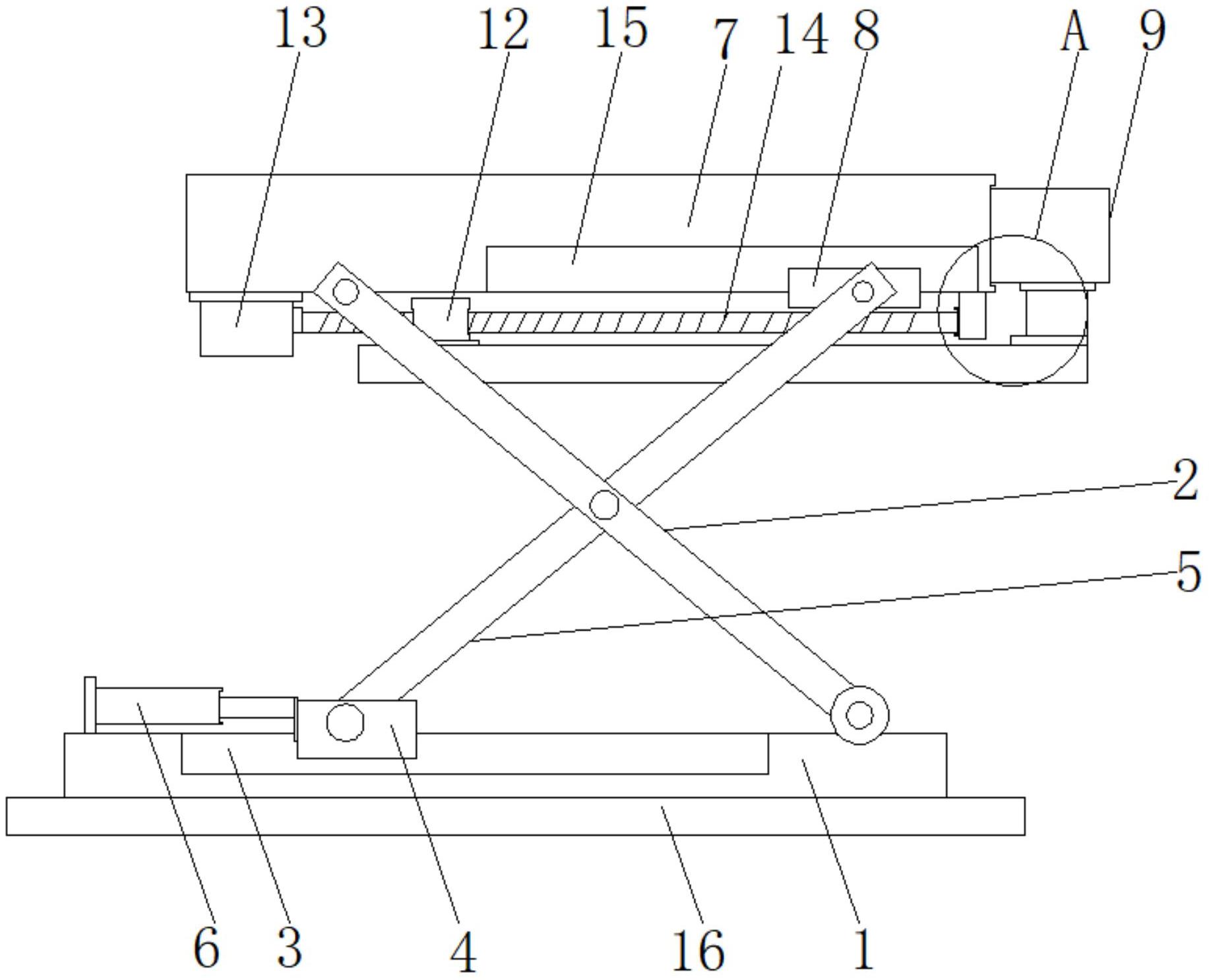 本实用新型公开了一种新能汽车的维修用的调节梯,包括固定板,所述固定板的顶部转动有连接杆,且固定板的顶部设置有滑槽,所述滑槽的内壁滑动连接有滑块,且滑块上转动连接有固定杆,所述滑块与固定板之间设置有液压缸,所述连接杆的顶端转动有支撑板,且固定杆的顶端转动有限位块,所述限位块与支撑板的底部滑动连接,本实用新型涉及汽车维修技术领域。该新能汽车的维修用的调节梯,解决了现有的调节梯顶部空间小,不能伸展空间,对汽车维修起到了阻碍,大大降低了汽车维修的效率的问题。