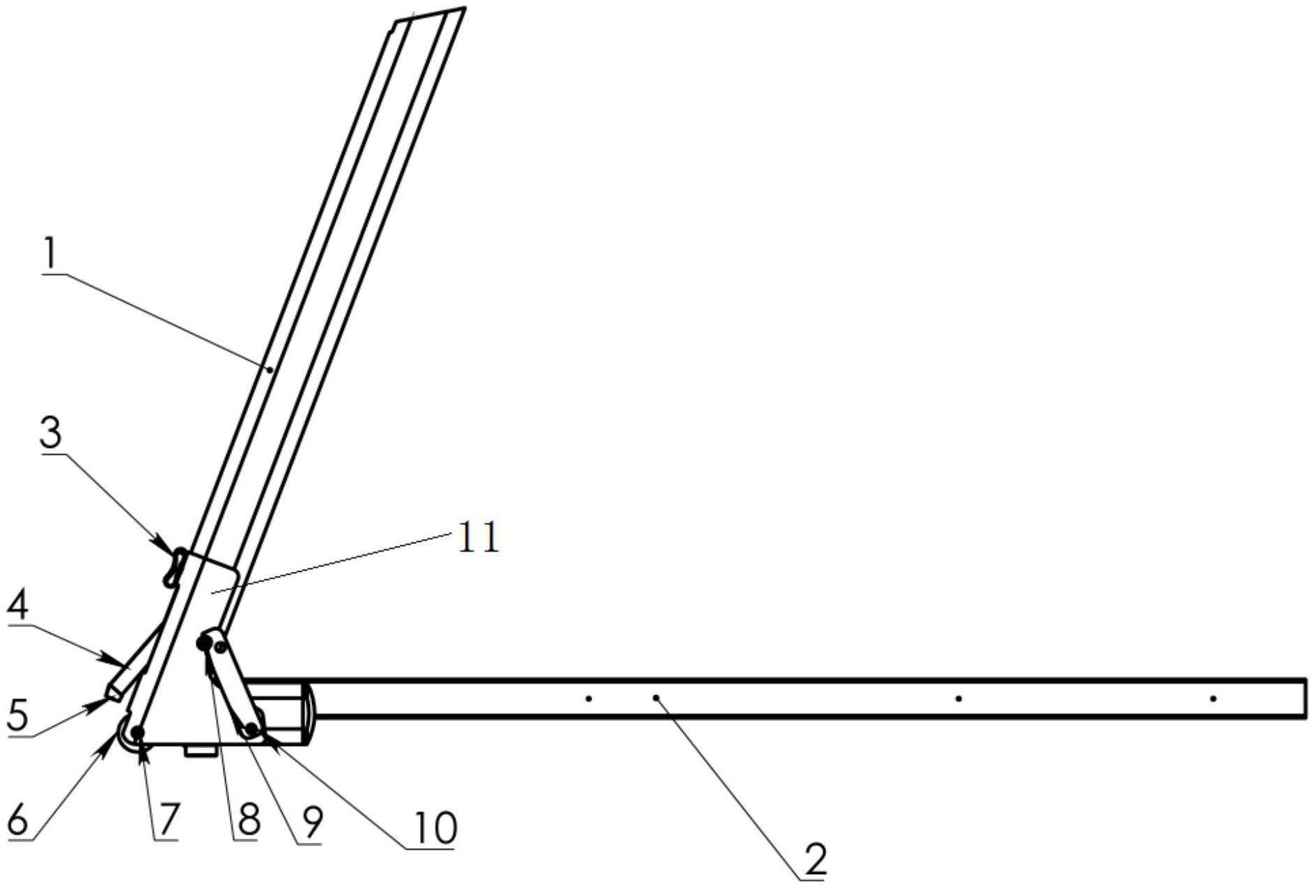本实用新型涉及运动器械技术领域,具体地说是一种跑步机折叠锁紧支撑结构,包括立柱、主架、连接板、支脚,立柱与连接板上端之间采用固定螺丝固定,立柱的下端设有支脚,支脚的端部穿过连接板的前侧,支脚的端部设有支脚垫,立柱固定片的一端、连接板的下端以及主架之间采用螺丝二固定,立柱处于竖立位置时,立柱与连接板之间采用锁紧插销锁紧,立柱固定片的另一端钩住固定螺丝,立柱处于水平位置时,立柱固定片的另一端与立柱之间采用锁紧插销锁紧。本实用新型同现有技术相比,设计了跑步机折叠锁紧支撑结构,在立柱与主架折叠、打开时,完成支脚的伸出或回收,更方便立式支撑存储,锁紧后存放也更安全。