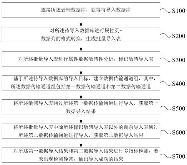 本发明提供了一种体测数据的高效批量导入方法及系统,涉及数据导入处理技术领域,获取待导入数据库,进行属性列‑数据列的格式转换生成批量导入表,进行属性数据敏感性分析并标识敏感导入表,建立数据传输通道组,将敏感导入表基于第一数据传输通道进行导入;将剩余导入表通过第二数据传输通道进行导入,获取数据导入结果并进行多指标检测,若未出现检测异常,输出导入成功的结果,解决了现有技术中数据的批量导入方法智能度不足,无法针对数据差异化基于专向通道进行导入,使得最终的数据的导入效率较低,导入准确度不足的技术问题,通过进行数据标准化与数据分类,分别构建传输通道进行专向传输,实现数据的高效、高精度导入。
