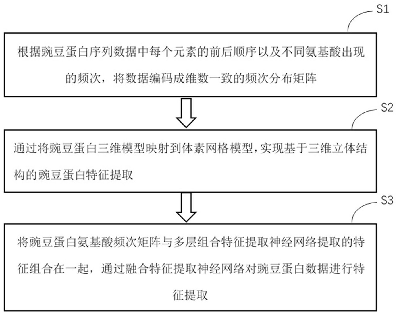本发明公开了一种豌豆蛋白数据特征提取方法,包括以下步骤:根据豌豆蛋白序列数据中每个元素的前后顺序以及不同氨基酸出现的频次,将数据编码成维数一致的频次分布矩阵;通过将豌豆蛋白三维模型映射到体素网格模型,实现基于三维立体结构的豌豆蛋白特征提取;将豌豆蛋白氨基酸频次矩阵与多层组合特征提取神经网络提取的特征组合在一起,通过融合特征提取神经网络对豌豆蛋白数据进行特征提取,经过蛋白序列数据的特征提取和编码方面的探讨,将维数不一致的序列数据编码成维数一致的向量,解决了不能直接把氨基酸序列数据输入机器学习算法中进行识别的问题,并且通过在特征提取中引入频次矩阵,增强特征提取的准确性和全面性。