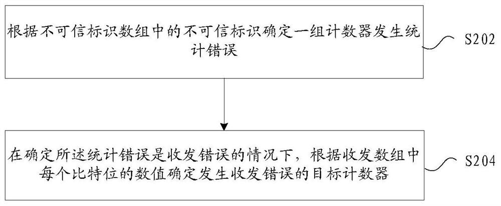 本发明提供了一种计数器的确定方法及装置,包括:根据不可信标识数组中的不可信标识确定一组计数器发生统计错误,其中,一组计数器包括至少两个计数器;在确定统计错误是收发错误的情况下,根据收发数组中每个比特位的数值确定发生收发错误的目标计数器,其中,收发数组包括至少两个比特位,比特位与计数器一一对应,每个比特位用于表示计数器的信息收发状态。通过本发明,解决了计数器的定位方法效率低的问题,进而达到了提高计数器的定位效率的效果。