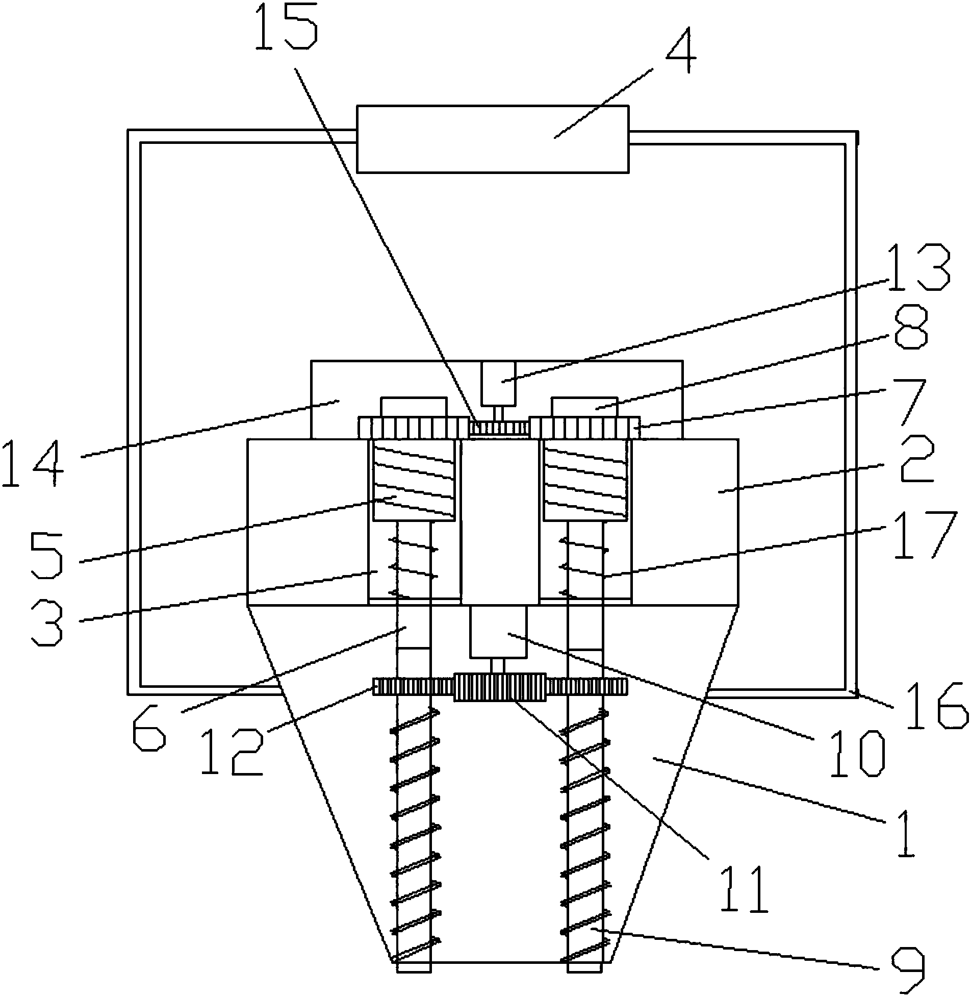 本实用新型公开了一种多头螺杆充填装置,包括壳体和出料装置,壳体顶部设有盖板,盖板内设有若干孔形槽,孔形槽内设有第一柱体,第一柱体与孔形槽螺纹连接,第一柱体底部设有第二柱体,第二柱体可穿过孔形槽的底部,出料装置设于壳体内,第二柱体底部与出料装置顶部相连,第一柱体的顶部设有第一齿轮,第一齿轮顶部设有第一磁铁,第一磁铁的上方设有用于拆卸第一柱体的拆卸装置,第一齿轮、第一磁铁均可穿过拆卸装置,拆卸装置上方设有用于吸附第一磁铁的磁吸装置,通过本装置可以方便地拆卸出料装置,并且拆卸效果较好,拆卸效率较高,极大的方便了用户的使用。