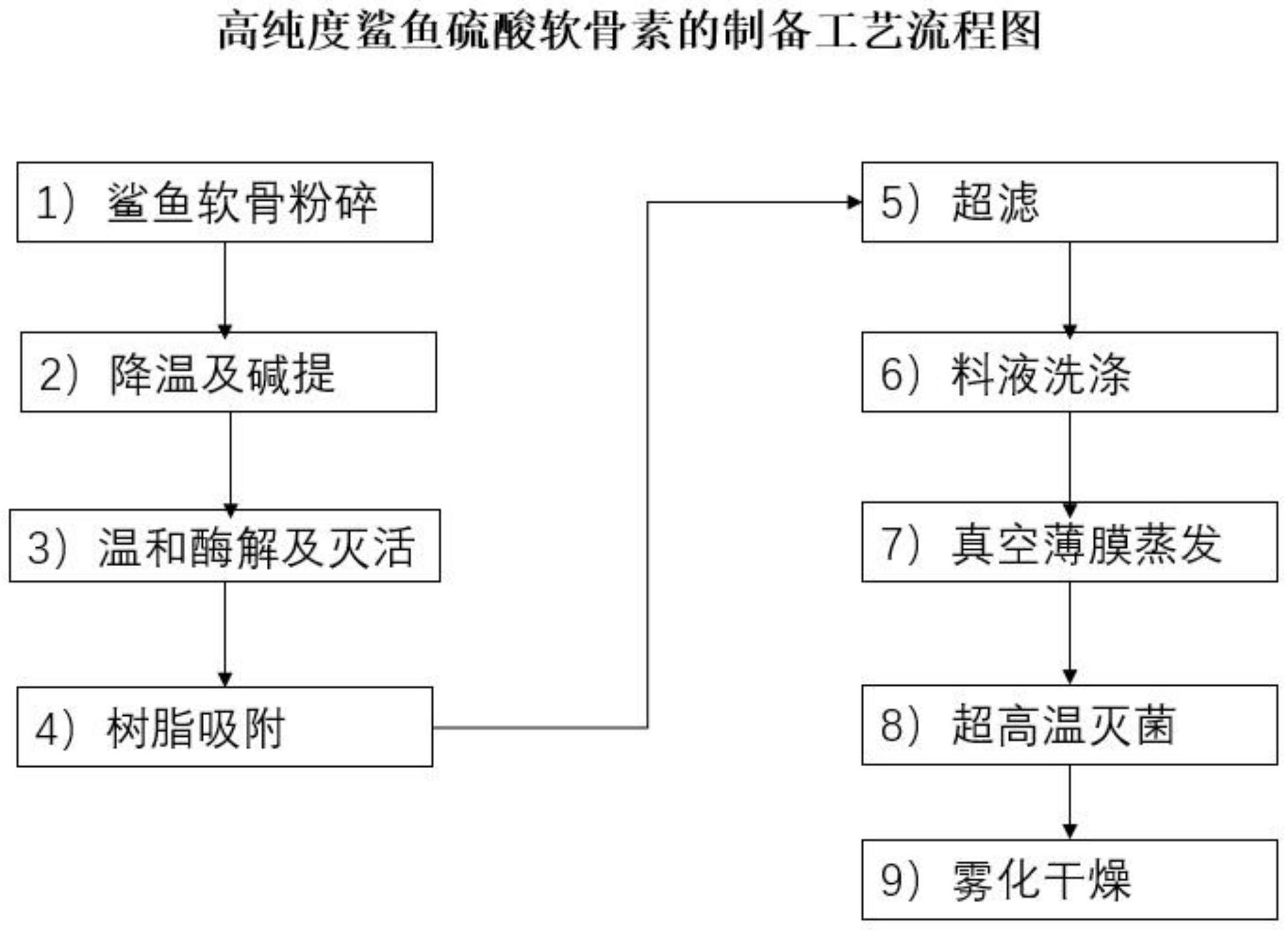 本发明属于海洋生物制品领域,尤其涉及一种具有抗肿瘤功效的高纯度鲨鱼硫酸软骨素的制备工艺,包括以下主要步骤:1)鲨鱼软骨粉碎;2)降温及碱提;3)温和酶解及灭活;4)树脂吸附;5)超滤;6)料液洗涤;7)真空薄膜蒸发;8)超高温灭菌;9)雾化干燥。使用本方法所制得的鲨鱼硫酸软骨素的CPC法含量高,砷含量低,纯度超出USP标准品的含量,同时在本发明制备过程的弱碱和低温的条件下,对硫酸软骨素中存在的糖苷键也不会产生明显的切割作用,从而能够使硫酸软骨素保持完整的分子结构,从而使产品收率得到有效提高,同时经过以上的温和条件操作能够保持产品更好的生物活性和颜色。