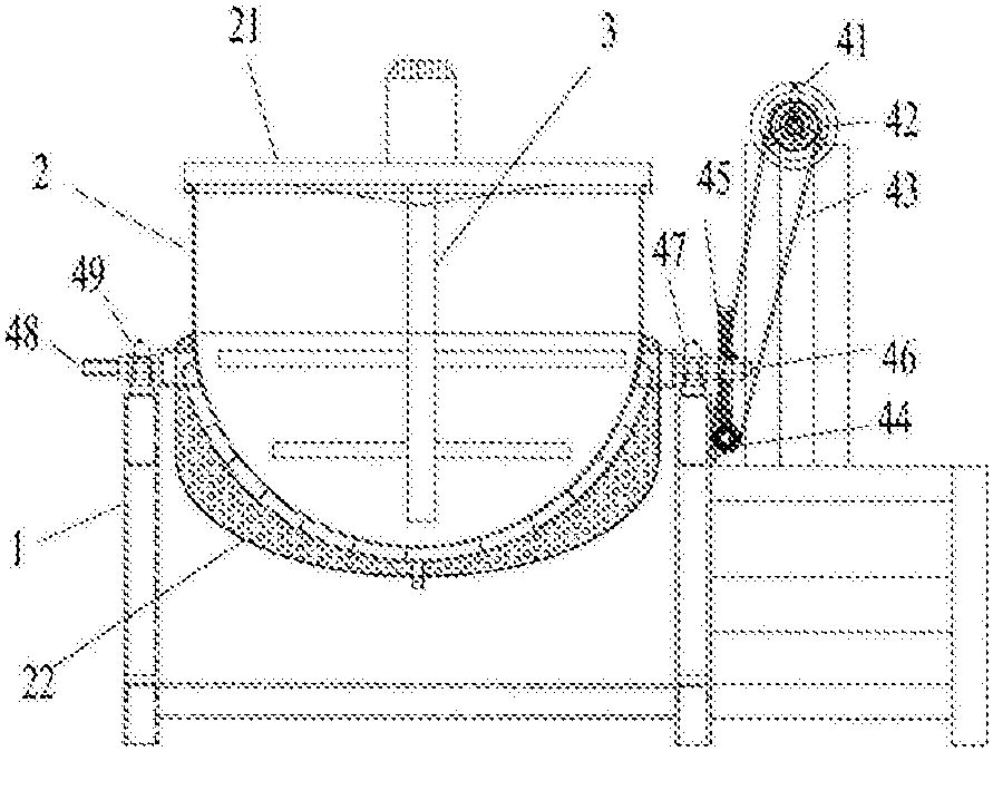 本实用新型涉及脱脂设备领域,具体涉及一种动物结缔组织高效脱脂设备,包括底座、反应釜和搅拌器,搅拌器安装在反应釜上部的盖体上,还包括翻转装置,翻转装置包括摇把,与摇把固定连接的上齿轮,与上齿轮以链条连接的下齿轮,与下齿轮连接的蜗杆蜗轮,与蜗杆蜗轮连接的连接杆,连接杆的另一端通过底座上的轴承和轴承座套件一与反应釜固定连接,反应釜上与连接杆相对的一端固定有转动轴,转动轴以轴承和轴承座套件二固定在底座上。本实用新型结构简单,可以对动物结缔组织表面夹带大量动物油脂进行脱脂处理,能有效防止下步工序多糖、蛋白提取时的油脂污染堵塞设备,油脂渗透到产品中,污染产品造成指标超出标准等问题,具有潜在的市场价值。