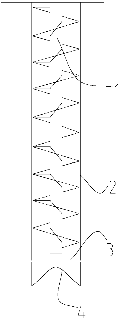 本实用新型提供了一种辅食营养包螺杆充填灌装防漏料装置,包括下料螺杆,所述下料螺杆套装在螺杆套管内,所述螺杆套管内的一端设有防漏堵片,所述螺杆套管与所述防漏堵片相邻的一端设有弧形凹槽,在粉剂包装机生产过程中,螺杆充填灌装停止动作后,能有效堵住物料,防止物料泄漏,控制因此导致的封口不严等问题。