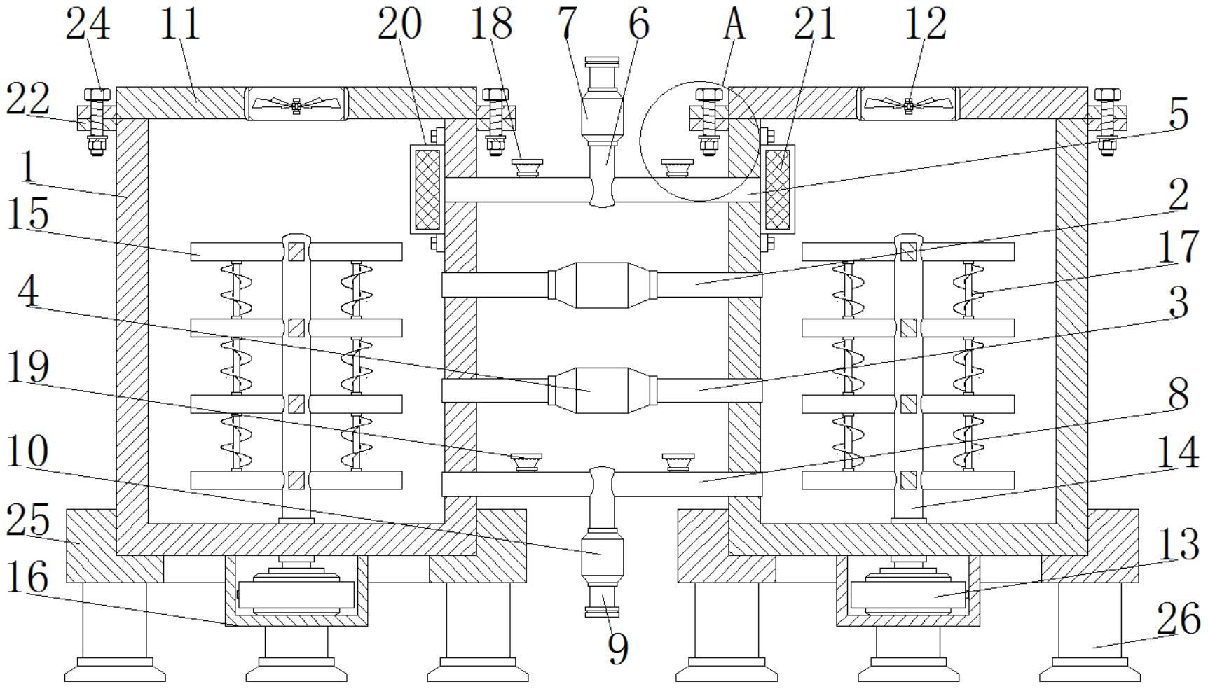 本实用新型公开一种冷却效率高的冷却水塔,包括桶体,所述桶体对称设置有两组,两组所述桶体之间连接有第一循环管和第二循环管;本实用新型通过将桶体设置为两组并在进水支管和排水支管上分别设置第一控制阀和第二控制阀,从而使其中一个桶体损坏维修时可以继续使用另一个桶体,使该冷却水塔实现一备一用的功能,进而保证了生产设备的正常生产加工,通过电机驱动搅拌轴带动搅拌杆旋转,使冷却用水在桶体内自转,从而提高了换热风扇对冷却水的散热效率,实用性较高,通过在桶体之间设置第一循环管和第二循环管,从而使冷却水在两个桶体之间循环流动,进而提高了冷却水的冷却效率,在同时为多台生产设备提供冷却时也能保证冷却效果。