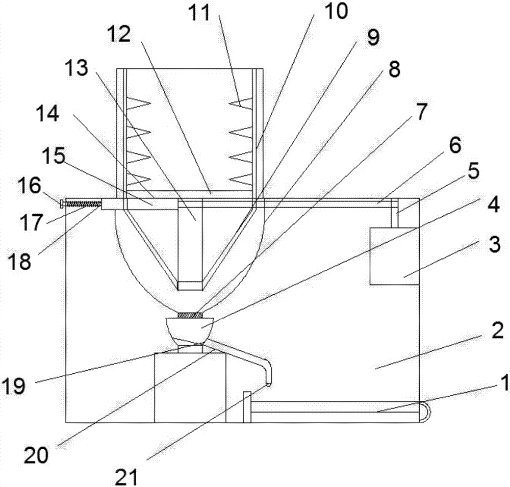 本实用新型的目的是一种渣汁分离的水果面膜机,包括面膜机的机壳,所述的机壳的上端设有榨汁桶,所述的榨汁桶的底部为旋转盘,旋转盘与机壳顶部的榨汁入口连接,所述的旋转盘的下方设有能够渣汁分离的旋转分离装置,所述的旋转分离装置包括旋转分离斗和过滤斗,旋转分离斗通过旋转轴与旋转盘的底部连接,旋转轴通过旋转带与机壳内驱动电机的转轴连接,过滤斗设在旋转分离斗正下方,过滤斗的过滤口下方设有集液斗,集液斗出汁口处的出汁管设在机壳底部的面膜成型盘上方,能够通过双级筛选分离进行逐级筛选,以提高筛选精度,以达到渣汁完全分离,提高面膜的精细程度,提高面膜质感和质量。