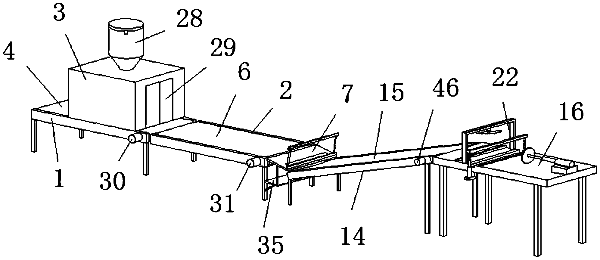 本实用新型提供一种自动化取出结晶桶中薄荷结晶的装置,包括一号传送架和二号传送架,所述一号传送架一端布置有二号传送架,所述一号传送架顶端固定连接有结晶室,所述一号传送架内部转动连接有一号传动带,所述结晶室内部布置有结晶桶,所述二号传送架内部转动连接有二号传送带,所述二号传送架一端布置有倾斜板,所述倾斜板顶端固定连接有支撑柱,所述支撑柱顶端固定连接有搀扶板,所述倾斜板底端转动连接有支撑架。设计新颖,可以对结晶桶进行良好的运输,且能够有效的防止结晶桶在运输时内部的结晶块出现破裂现象,同时可以对结晶块进行自动取出,不会对结晶桶造成破坏,操作较为简单,大大的提升了装置的使用效果。