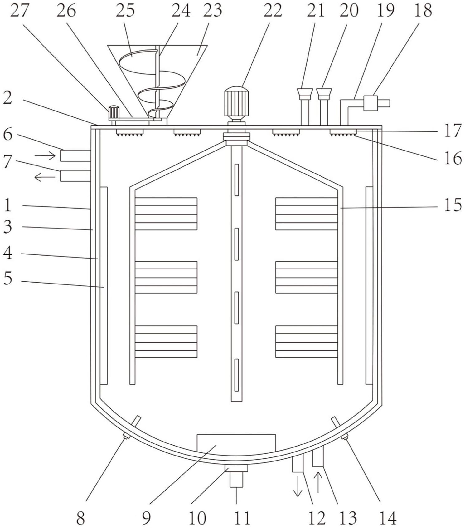 本实用新型涉及一种小麦蛋白提取装置,包括罐体和罐盖,罐盖顶部外侧设有进料斗、进水管,进料斗内部设有在第二转轴带动下旋转的螺旋叶,进水管连接分布在罐盖内侧的喷水管道和喷嘴,罐体内部设有框式搅拌装置,第一转轴和搅拌杆在第一电机带动下同轴转动,且第一转轴和搅拌杆两侧设有平行相错的搅拌叶组合,搅拌叶组合内部水平排列倾斜设置的搅拌叶片,罐体内部底部固定安装卧式离心机。本实用新型在进料斗中安装螺旋叶,从而缓慢加入小麦蛋白粉,同时采用一种框式搅拌装置与卧式离心机配合,防止低温下小麦蛋白粉与水结块,在罐体底部和中间聚集大颗粒,从而将小麦蛋白搅拌更均匀、溶解更充分。