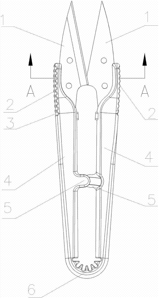 本实用新型涉及一种纱剪,尤其是可磨削免换刀片的纱剪,包括塑料手柄和设置在手柄前端的刀片,手柄为U形结构,手柄内侧设有合扣,手柄前端背部设有按压面,所述手柄u形结构底部内侧为波浪形回动弹簧结构;所述按压面与刀片平面成一倾斜角;所述按压面表面设有防滑纹,所述手柄厚度从前端至后端逐渐减小。实用新型结构简单,操作轻松,剪切能力强,使用寿命长,刀片方便磨削,可多次利用,手柄和压面较宽,剪切抓握舒适,刀片放进手柄模具中一次成型,生产工艺简单,成本低,生产效率高。