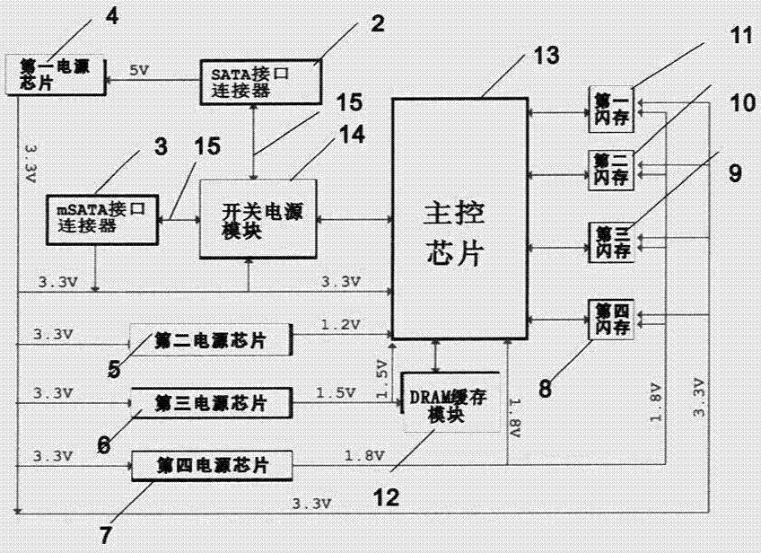 本实用新型涉及了SATA和mSATA双接口并存的固态硬盘,包括固态硬盘本体,固态硬盘本体内装有线路板,线路板上分别设有SATA和mSATA接口连接器,其分别连接开关电源模块,开关电源模块与主控芯片相互连接,第一电源芯片分别与第二、第三、第四电源芯片、第一、第二、第三和第四内存,以及开关电源模块、主控芯片相互连接;上述技术方案通过根据电脑主板的固态硬盘接口的不同类型进行双接口设计,兼容了SATA和mSATA两种常用类型的接口,使得固态硬盘灵活连接在不同接口上。