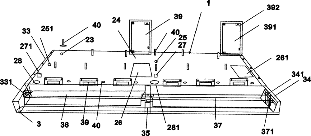本实用新型涉及了一种固态硬盘的测试平台,包括测试平台本体,测试平台本体包括测试平台台面和底架,测试平台台面通过螺丝固定在底架上;测试平台台面上设有第一和第二电脑主板区,第一电和第二电脑主板区分别设有多个支撑定位孔,第一和第二电脑主板区之间的区域,第一电脑主板区的左边设有第一开关电源线孔,其正前方设有第一开关定位孔,第一开关定位孔的前方设有第一工具口;通过上述技术,整个设计考虑周全,通过两块电脑主板分别连接多个固态硬盘,可同时或分开测试,操作方便简单,通过不同的电源线孔孔能有效收纳放置连接线,避免连接线过多而导致的杂乱,整体安全性高,可靠性强,而且稳定。