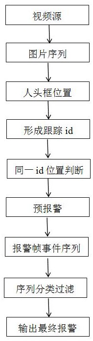 本发明提供一种基于人头检测与图片序列的学生起立检测方法,可以有效控制由于干扰造成的误报。步骤一、对特定目标进行检测:对某一输入的视频源,将该视频源分离成图片序列;利用检测器模型对图片序列中图片的人头目标进行检测;将不同帧的人头框位置利用位置的重合率进行关联匹配;遍历整个跟踪队列,利用该id的历史位置与当前位置进行关联,通过当前位置和历史位置的关系判断是否存在起立事件预警。步骤二、对特定目标进行分类过滤:对存在起立事件预警的id对应的目标,以该目标人头框中心为中点,扩充截取包含该目标的区域;将起立事件预警的某一帧,从该帧前后各取一定的图片数量,并从中截取对应扩充后的区域,送入分类器中进行判断。