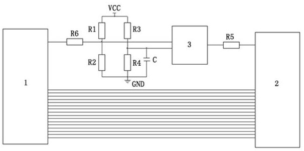 本实用新型提供一种降低SDI输出信号抖动的电路,SDI输出信号抖动低,符合SDI规范要求。视频处理器输出电路的时钟信号输出接口通过信号传输导线与时钟芯片的信号输入端连接,且在该信号传输导线上连接有端接电路;第一上拉电阻的一端与电源正极连接,另一端与所述的信号传输导线连接;第一下拉电阻的一端与电源负极连接,另一端与所述的信号传输导线连接;第二上拉电阻一端与电源正极连接,第二下拉电阻一端与电源负极连接;第二上拉电阻另一端与第二下拉电阻另一端连接后接至时钟芯片的时钟输入口;滤波电容与第二下拉电阻并联;时钟芯片的信号输出端与SDI发送电路的时钟信号接收接口连接。