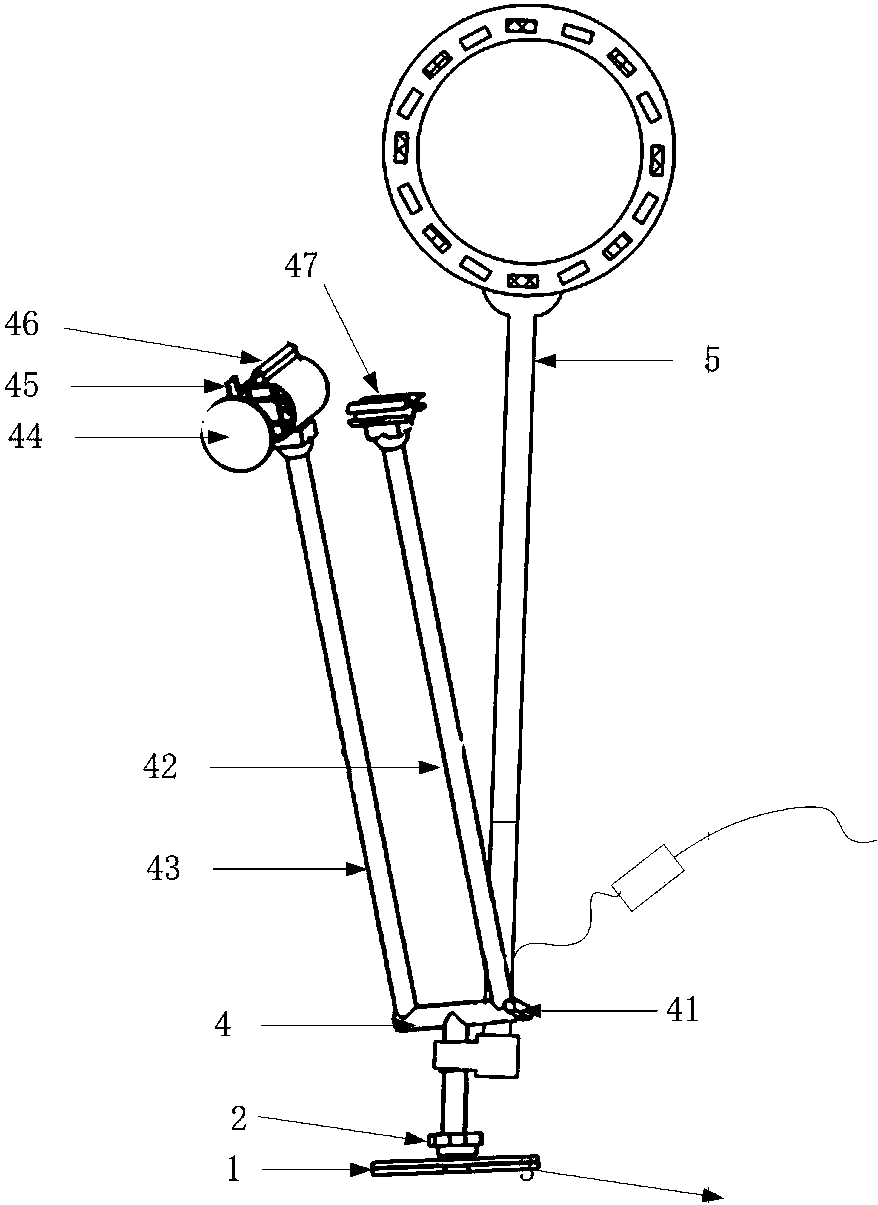 本实用新型涉及一种补光灯支架,包括底座、支架、第一万向波纹管、第二万向波纹管、补光灯、手机支架、麦克风支架和防喷罩,支架底部设置有螺纹拧紧器,支架通过螺纹拧紧器安装在底座上。本实用新型通过万向波纹管与支架的配合,实现手机、麦克风,补光灯的快速、简易安装,而且,手机,麦克风和补光灯都能以各种角度使用,极大提升了使用便利性。该补光灯支架,体积较小,使用方便,可以直接放到桌子上使用。