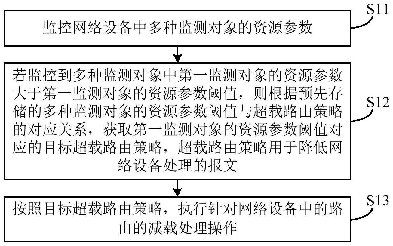 本申请实施例提供了一种路由处理方法、装置及网络设备,应用于网络设备,该方法包括:监控网络设备中多种监测对象的资源参数;若监控到多种监测对象中第一监测对象的资源参数大于第一监测对象的资源参数阈值,则根据预先存储的多种监测对象的资源参数阈值与超载路由策略的对应关系,获取第一监测对象的资源参数阈值对应的目标超载路由策略,超载路由策略用于降低网络设备处理的报文;按照目标超载路由策略,执行针对网络设备中的路由的减载处理操作。应用本申请实施例提供的技术方案,能够降低因网络设备超载带来的丢包、业务中断等情况出现的概率。
