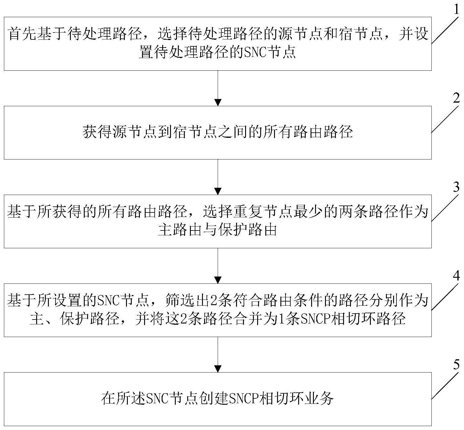 本发明公开了一种用于SNCP相切环业务的端到端路径配置方法,首先基于待处理路径,选择待处理路径的源节点和宿节点,并设置待处理路径的SNC节点;获得源节点到宿节点之间的所有路由路径;基于所获得的所有路由路径,选择重复节点最少的两条路径作为主路由与保护路由;基于所设置的SNC节点,筛选出2条符合路由条件的路径分别作为主、保护路径,将这2条路径合并为1条SNCP相切环路径;在所述SNC节点创建SNCP相切环业务。上述方法不需要逐点配置,也不需要创建保护子网,设置灵活、操作简单,且业务配置效率高。