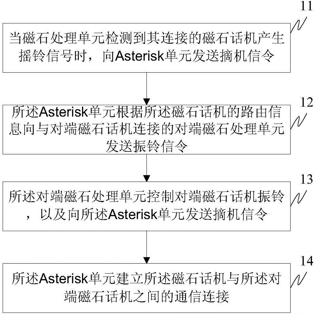 本发明实施例提供一种基于Asterisk的磁石话机通信方法及装置,其中,基于Asterisk的磁石话机通信方法及包括:当磁石处理单元检测到其连接的磁石话机产生摇铃信号时,向Asterisk单元发送摘机信令;Asterisk单元根据磁石话机的路由信息向与对端磁石话机连接的对端磁石处理单元发送振铃信令;对端磁石处理单元控制对端磁石话机振铃,以及向Asterisk单元发送摘机信令;Asterisk单元建立磁石话机与对端磁石话机之间的通信连接。实现将传统磁石话音业务接入IP网络中,完成磁石电话之间通过IP网络的互通。