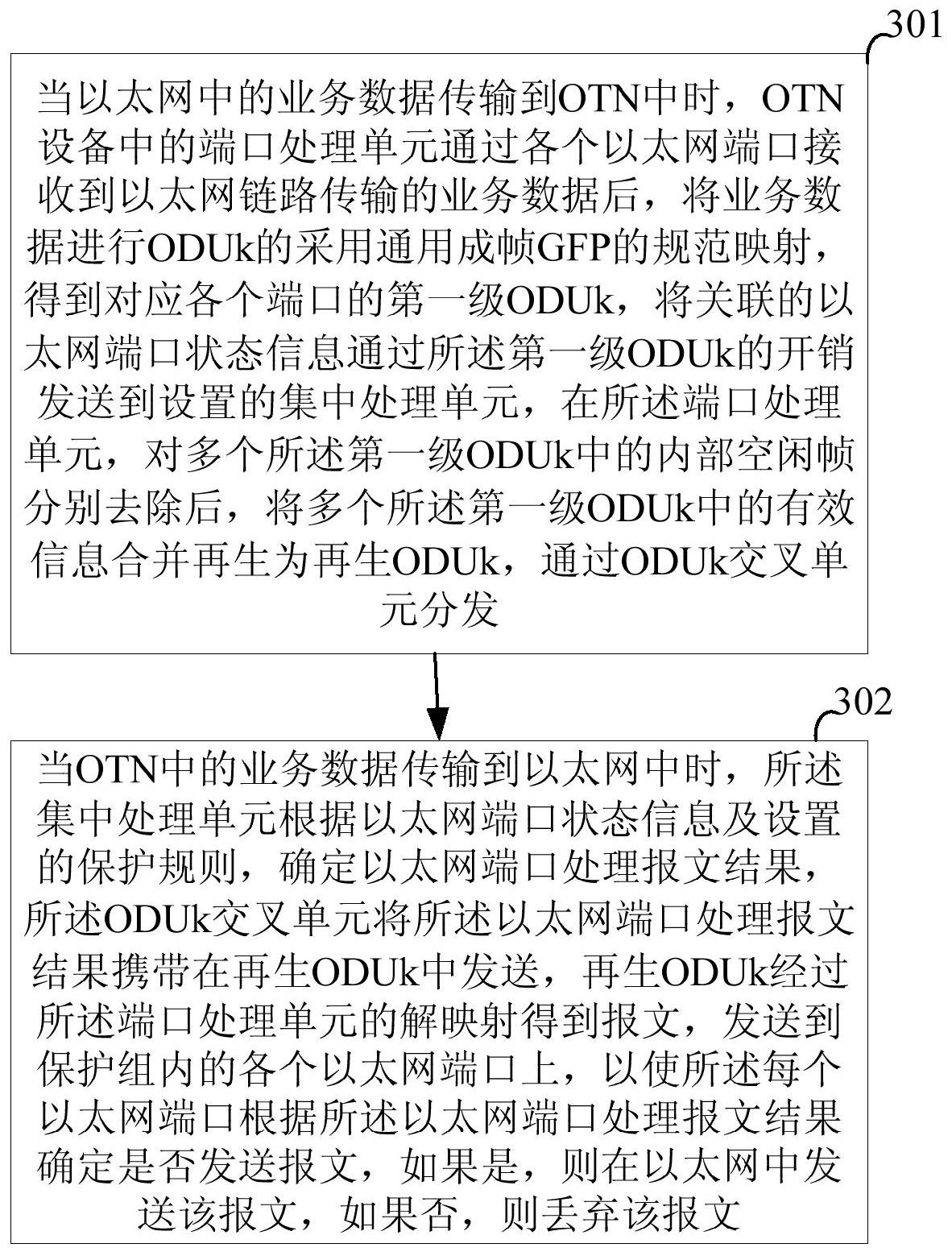 本发明公开了一种在光传输网络中对以太网链路的保护方法及装置:OTN设备中的端口处理单元通过各个以太网端口接收到以太网链路传输的业务数据后,将业务数据进行ODUk的采用通用成帧(GFP)的规范映射,得到对应各个端口的第一级ODUk,将关联的以太网端口状态信息通过所述第一级ODUk的开销发送到集中处理单元,对多个所述第一级ODUk中的内部空闲帧分别去除后,将多个所述第一级ODUk中的有效信息合并再生为再生ODUk,分发;集中处理单元根据以太网端口状态信息及设置的保护规则,确定以太网端口处理报文结果,将所述以太网端口处理报文结果携带在再生ODUk中发送,再生ODUk经过所述端口处理单元的解映射得到报文,发送到保护组内的各个以太网端口上,以使所述每个以太网端口根据所述以太网端口处理报文结果确定是否发送报文。这样,在OTN中,在OTN中实现跨板或跨设备的以太网链路保护。